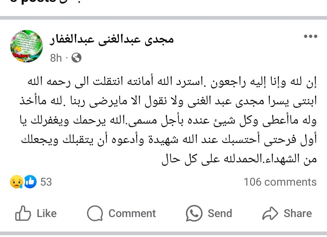 وكتب والد يسرا على صفحته الشخصية على موقع التواصل الاجتماعي فيسبوك: إنا لله وإنا إليه راجعون استرد الله أمانته انتقلت إلى رحمة الله ابنتى يسرا مجدي عبد الغني ولا نقول إلا ما يرضي ربنا، لله ما أخذ وله ما أعطى وكل شيء عنده بأجل مسمى، الله يرحمك ويغفر لك يا أول فرحتى أحتسبك عند الله شهيدة وأدعوه أن يتقبلك ويجعلك من الشهداء، الحمدلله على كل حال.