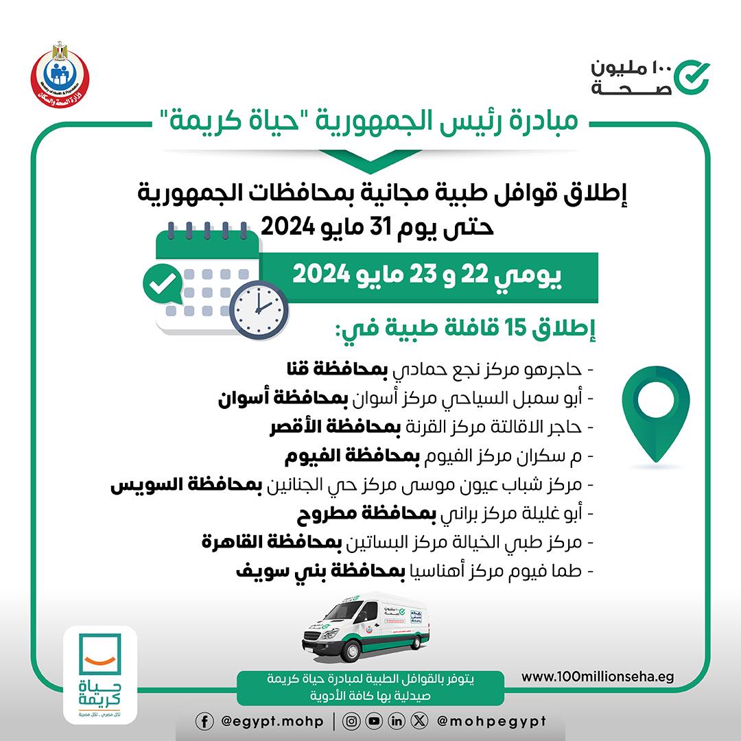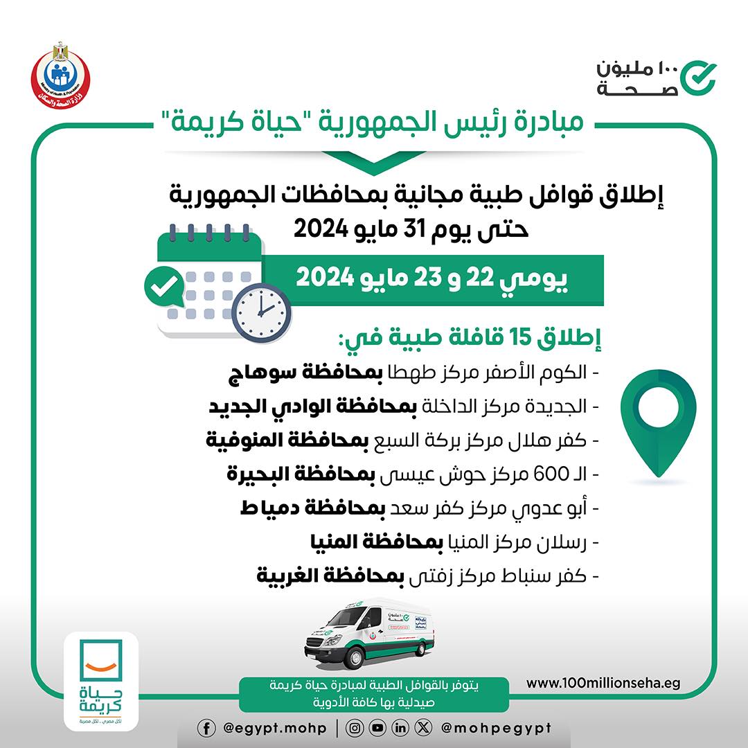 أعلنت وزارة الصحة عن إطلاق 15 قافلة طبية ضمن مبادرة رئيس الجمهورية حياة كريمة يومي ٢٢ و٢٣ مايو ٢٠٢٤ للكشف والعلاج مجانًا في تخصصات “نساء وولادة - خدمات تنظيم الأسرة - الأطفال والباطنة - الأنف والأذن والعظام - الجراحة - الرمد الأسنان - القلب - الجلدية وخدمات الأشعة والتحاليل”.