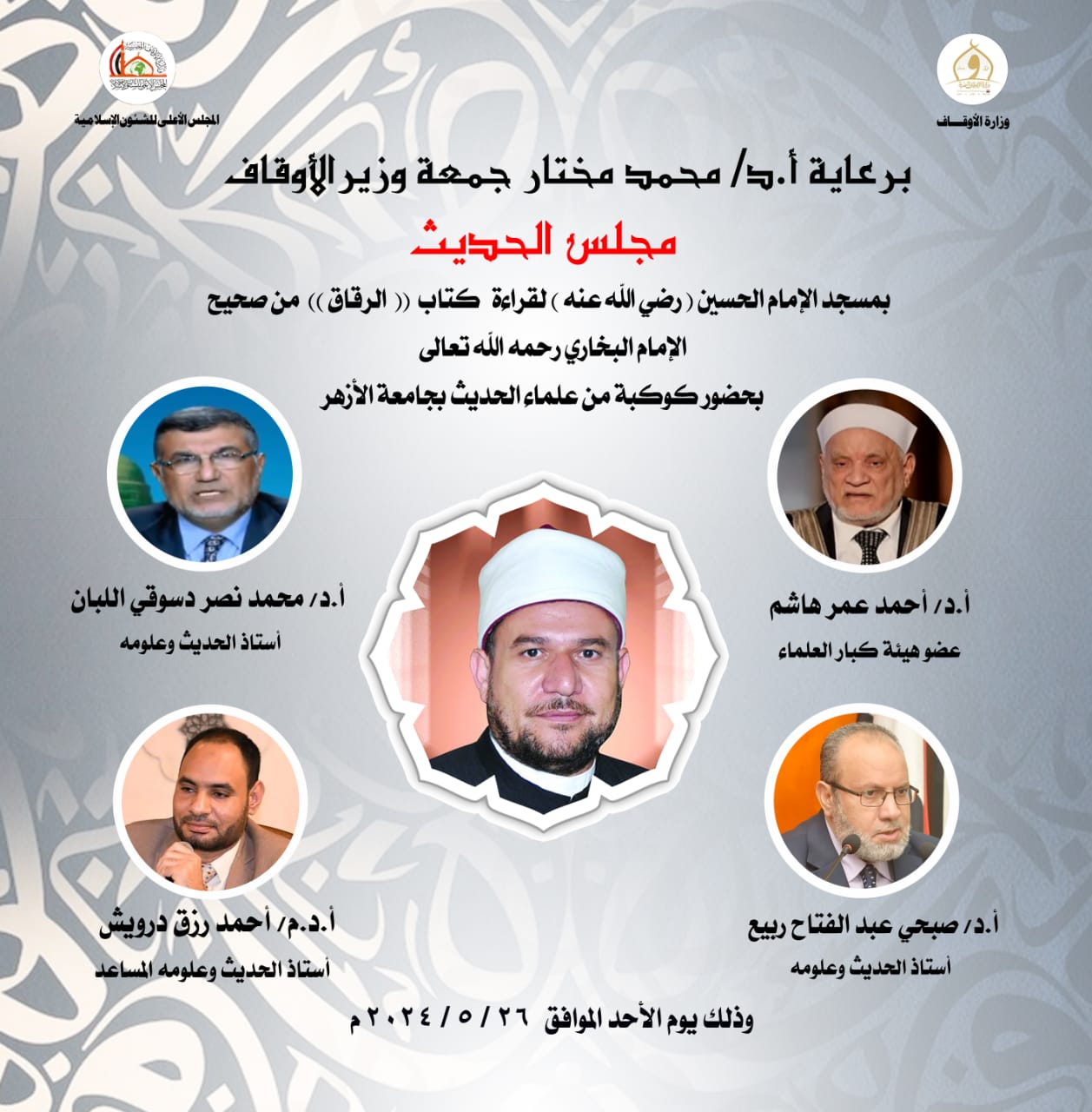 أعلنت وزارة الأوقاف أنه في إطار دور الوزارة لخدمة السنة النبوية المشرفة تنعقد المجالس الحديثية للمجلس الأعلى للشؤون الإسلامية ابتداءً من يوم الأحد الموافق: 26/ 5/ 2024م عقب صلاة العصر، بحضور كوكبة من علماء الحديث، وهم: