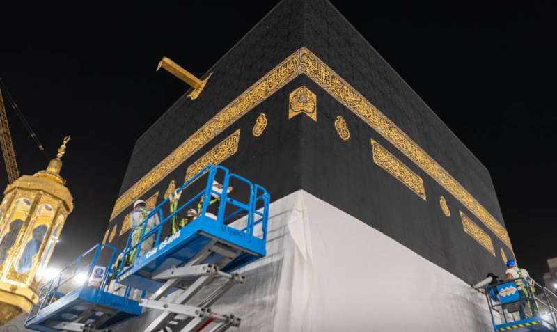 وأوضحت “شؤون الحرمين” أن الكسوة بارتفاع 3 أمتار من أسفل الكعبة المشرفة ويغطى الجزء المرفوع بقماش قطني أبيض بعرض 2.5 متر وطول 54 مترًا من الجهات الأربع للكعبة المشرفة.