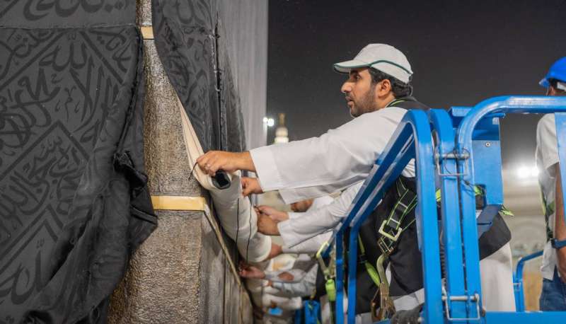 وذكرت أن الأعمال تبدأ بفك أسفل الكسوة من جميع الجوانب وفصل أركان الكسوة وفك الحبل السفلي وإخراجه من حلقات تثبيت الكسوة ولف الكسوة بارتفاع 3 أمتار وموازاتها على ارتفاع واحد وتثبيتها.