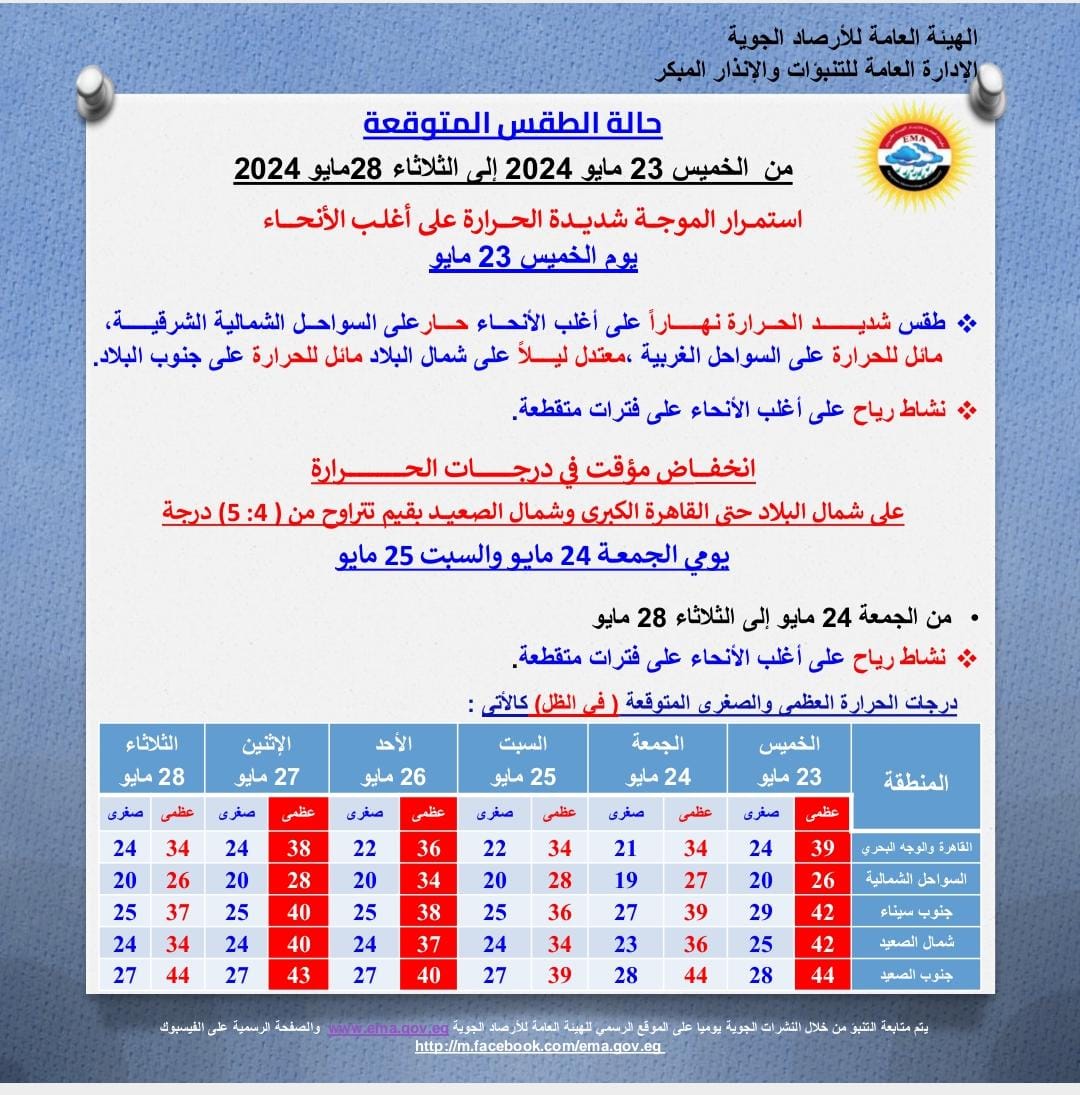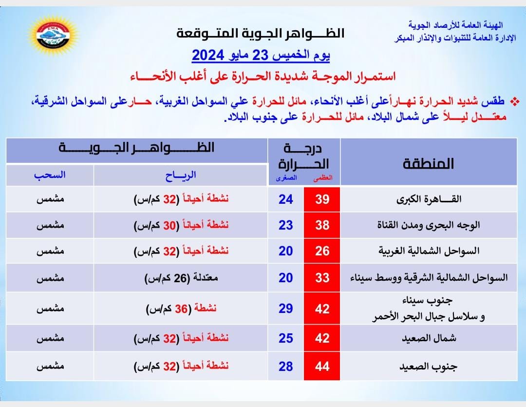 كشفت هيئة الأرصاد الجوية، عن حالة الطقس المتوقعة اليوم الخميس 23 مايو، مؤكدة استمرار الموجة شديدة الحرارة اليوم الخميس.