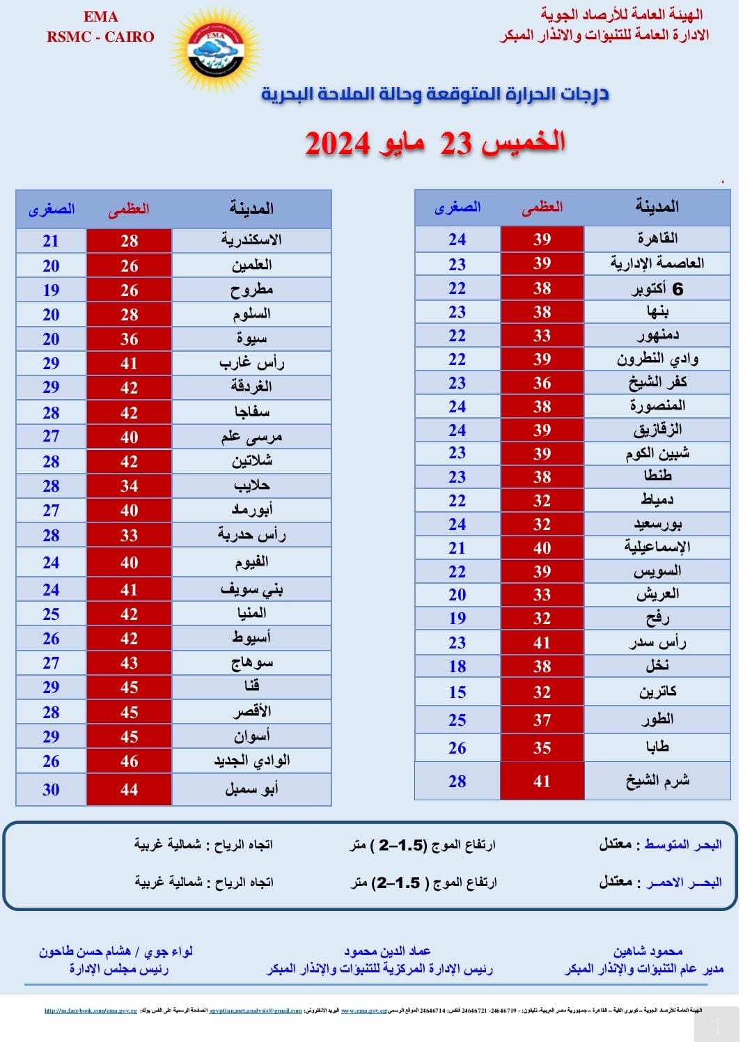 ونشرت هيئة الأرصاد بيان بدرجات الحرارة المتوقعة اليوم الخميس على مدن ومحافظات مصر وجاءت كالتالي: