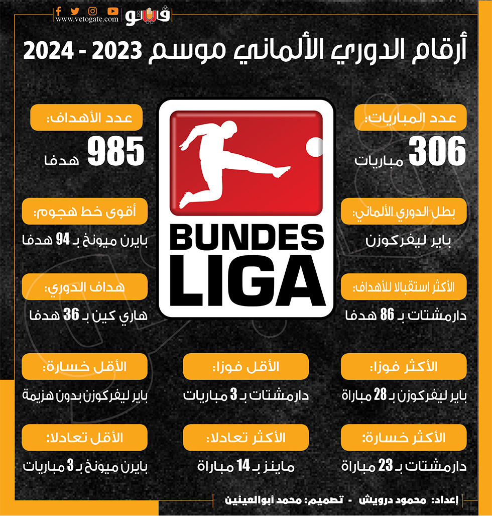 أرقام الدوري الألماني موسم 2023 - 2024 (إنفوجراف) السبت 25/مايو/2024 - 10:30 ص 5/25/2024 10:30:21 AM باير ليفركوزن محمود درويش شارك طباعة 18 حجم الخط شارك طباعة الدوري الألماني باير ليفركوزن بايرن ميونخ هاري كين دارمشتات ماينز