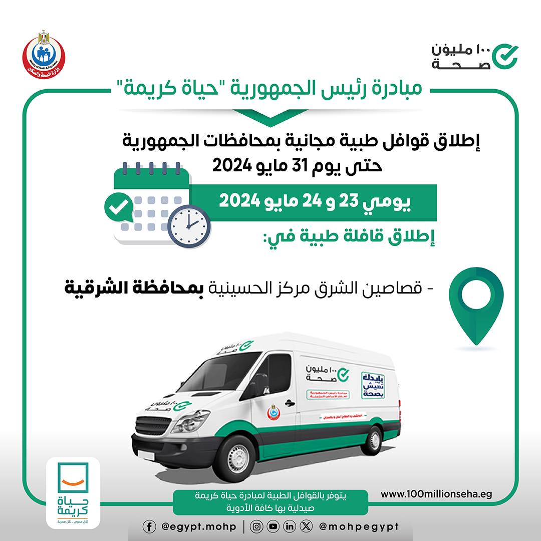 أعلنت وزارة الصحة إطلاق قافلة طبية ضمن مبادرة رئيس الجمهورية حياة كريمة يومي ٢٣ و٢٤ مايو ٢٠٢٤، للكشف والعلاج مجانًا في التخصصات الطبية " نساء وولادة - خدمات تنظيم الأسرة – الأطفال- الباطنة - الأنف والأذن- العظام - الجراحة - الرمد الأسنان - القلب – الجلدية وخدمات الأشعة والتحاليل بمحافظة الشرقية".