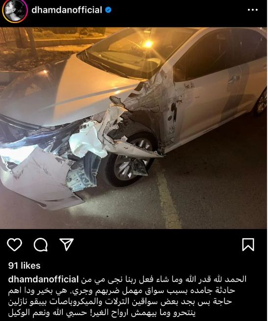 ونشرت دانا حمدان صورة لسيارة مي وهي محطمة، معلقة عليها: "الحمد لله قدر الله وما شاء فعل، ربنا نجى مي من حادثة جامدة بسبب سواق مهمل، ضربهم وجري، هي بخير ودا أهم حاجة".