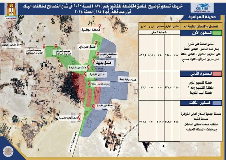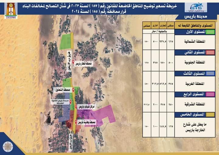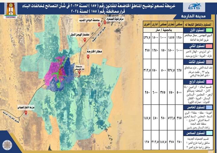 نشرت محافظة الوادي الجديد، في بيان رسمي لها على صفحتها الرسمية على موقع التواصل الاجتماعي ، اليوم الخميس، خرائط تسعير المناطق الخاضعة لقانون التصالح في مخالفات بكافة مدن المحافظة، مُوضّح بها سعر المتر بكل منطقة باختلاف النشاط المقام ( سكني - تجاري - إداري - صناعي - آخر).