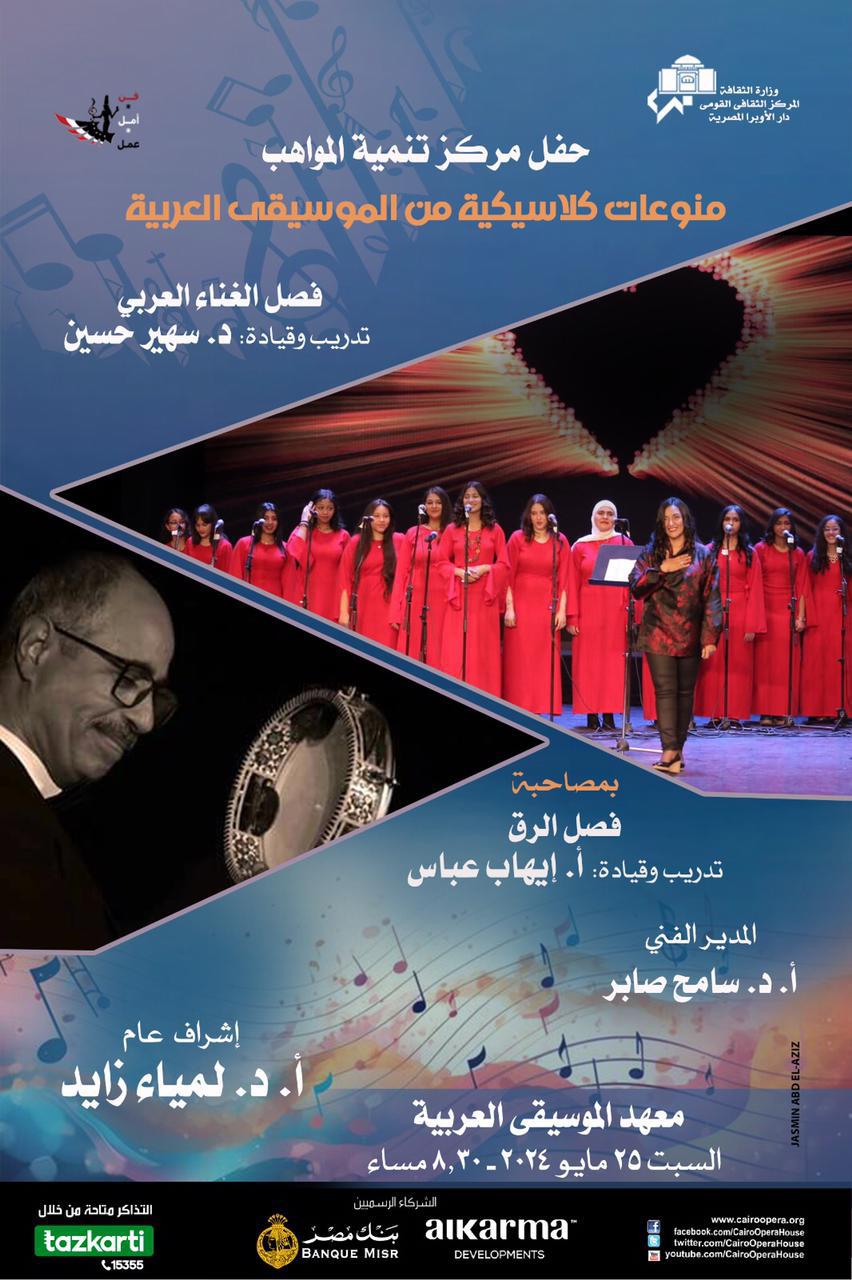تنظم دار الأوبرا المصرية برئاسة الدكتورة لمياء زايد حفلا بعنوان "منوعات كلاسيكية من الموسيقى العربية" لطلاب مركز تنمية المواهب تحت إشراف المدير الفنى للمركز الدكتور سامح صابر، وفصل الغناء العربى تدريب وقيادة الدكتورة سهير حسين.