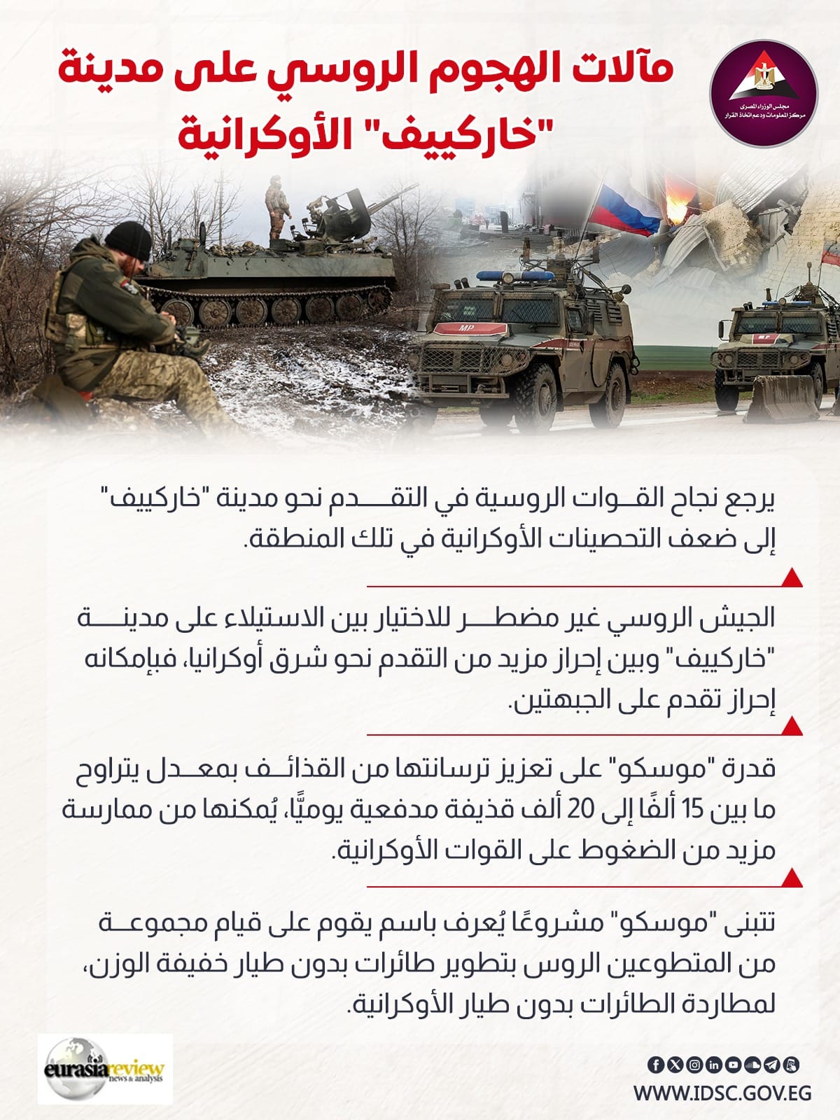 سلط مركز المعلومات ودعم اتخاذ القرار بمجلس الوزراء الضوء على مآلات الهجوم الروسي على مدينة خاركييف الأوكرانية.