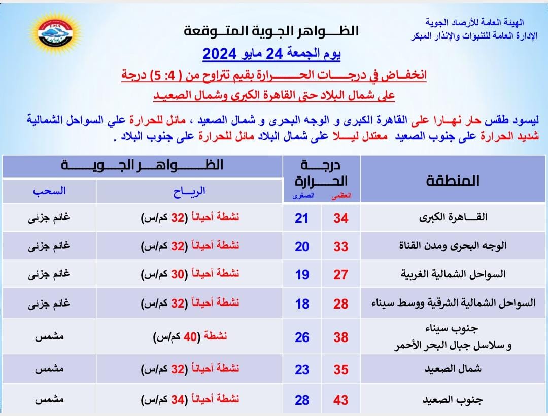 وقالت هيئة الأرصاد في بيان أن درجات الحرارة اليوم الجمعة تنخفض بقيم تتراوح من 4:5 درجات على شمال البلاد من السواحل الشمالية حتى شمال الصعيد.