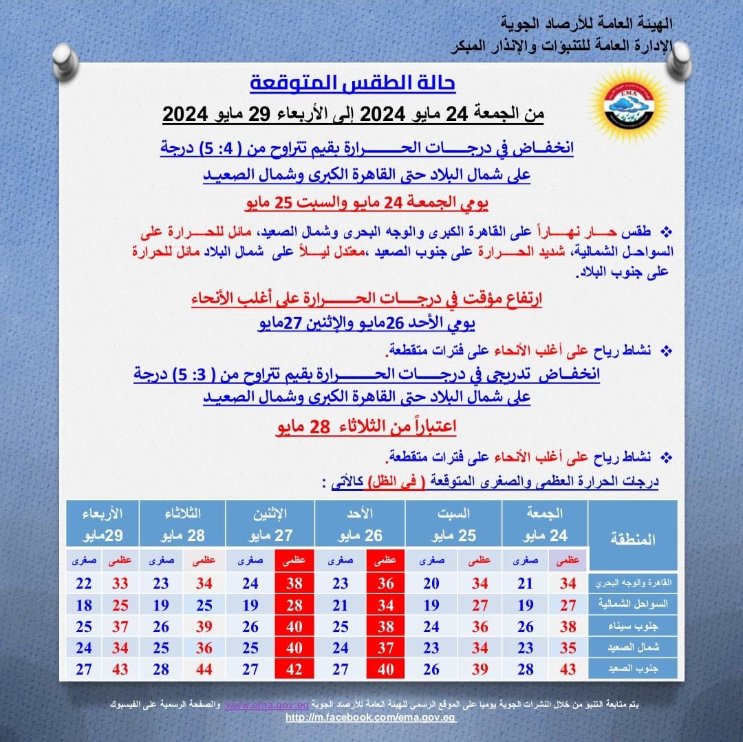 أعلنت هيئة الأرصاد الجوية، حالة الطقس اليوم الجمعة 24 - 5 - 2024، مؤكدة انكسار الموجة الحارة بعد أن أثرت لمدة أسبوع على كافة أنحاء البلاد وسجلت القاهرة 41 درجة.