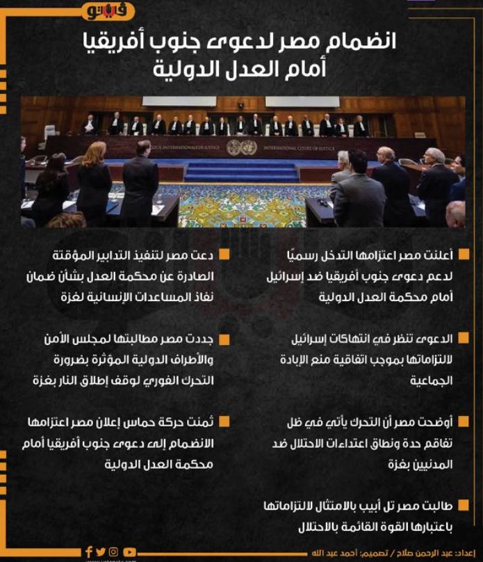 وفي بيان صادر عن وزارة الخارجية المصرية، في وقت سابق من الشهر الجاري، أعلنت مصر عن اعتزامها التدخل رسميا لدعم الدعوى التي رفعتها جنوب إفريقيا ضد إسرائيل أمام محكمة العدل الدولية للنظر في انتهاكات إسرائيل لالتزاماتها بموجب اتفاقية منع جريمة الإبادة الجماعية والمعاقبة عليها في قطاع غزة في حين ثمّنت حركة حماس موقف القاهرة.