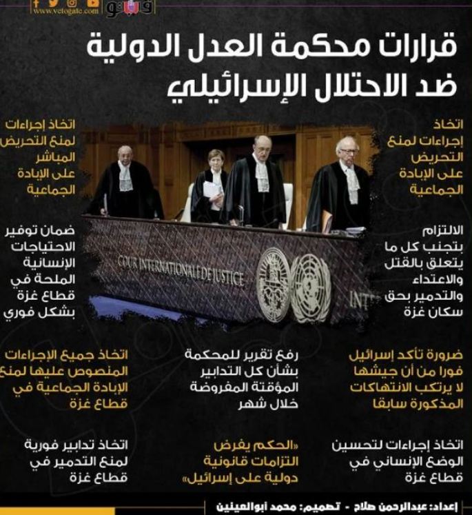 وأضافت محكمة العدل الدولية أن على إسرائيل الالتزام بتجنب كل ما يتعلق بالقتل والاعتداء والتدمير بحق سكان غزة، واتخاذ إجراءات لمنع التحريض المباشر على الإبادة الجماعية.