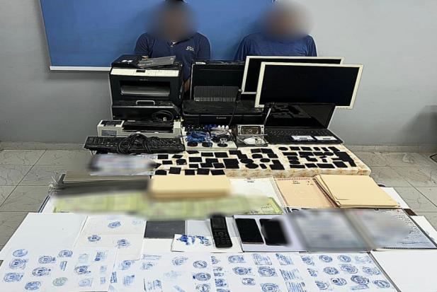 وعقب تقنين الإجراءات تم ضبطهما، وبحوزتهما "عدد من الأختام لشعار الجمهورية لجهات مختلفة "مزورين" – أكلاشيهات - الأجهزة والأدوات والأوراق والشهادات المستخدمة فى التزوير – 3 هواتف محمولة مُحمل عليها صور مستندات "مزورة" – مبالغ مالية".