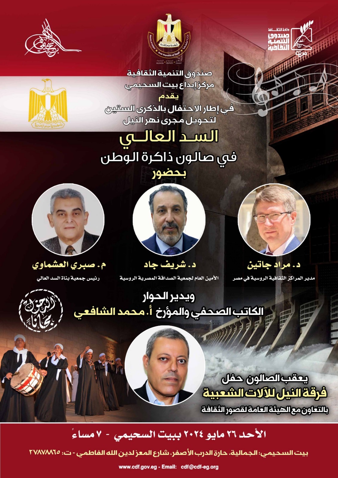 وشريف جاد الأمين العام لجمعية الصداقة المصرية الروسية، المهندس صبري العشماوي رئيس جمعية بناة السد العالي، ويدير الحوار الكاتب محمد الشافعي.