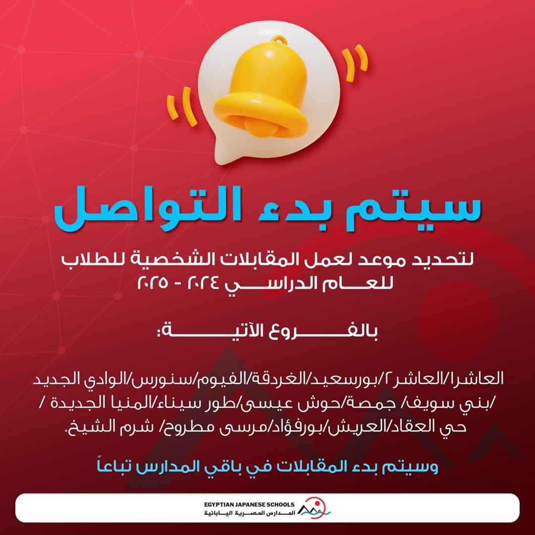 وأعلنت المدارس المصرية اليابانية أنه سيتم تحديد موعد عمل المقابلات الشخصية للطلاب بالمدارس الآتية: