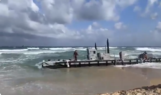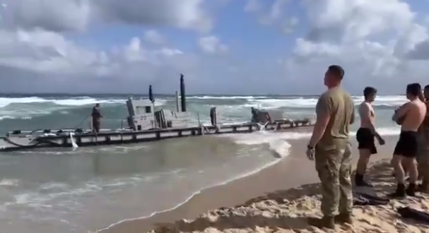 ويظهر الفيديو انهيار رصيف ميناء غزة، الذي أنشأته القوات الأمريكية، وابتعاده عن الشاطئ بمسافة لا تقل عن 30 كيلو، كما يظهر الجنود الأمريكان وهم في حالة اندهاش لانهيار الميناء الاصطناعي، الذي قاموا بتأسيسه.