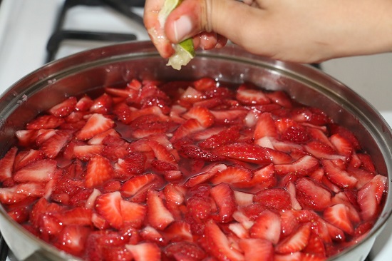 نلاحظ تكون "ريم" أبيض على السطح، يتم التخلص منه أولا بأول، ثم نضيف عصير الليمون والذي يساعد على تماسك قوام مربى الفراولة، ثم ملح الليمون والذي يقوم بدور المادة الحافظة التي تساعد على الاحتفاظ بمربى الفراولة لمدة عام كامل.