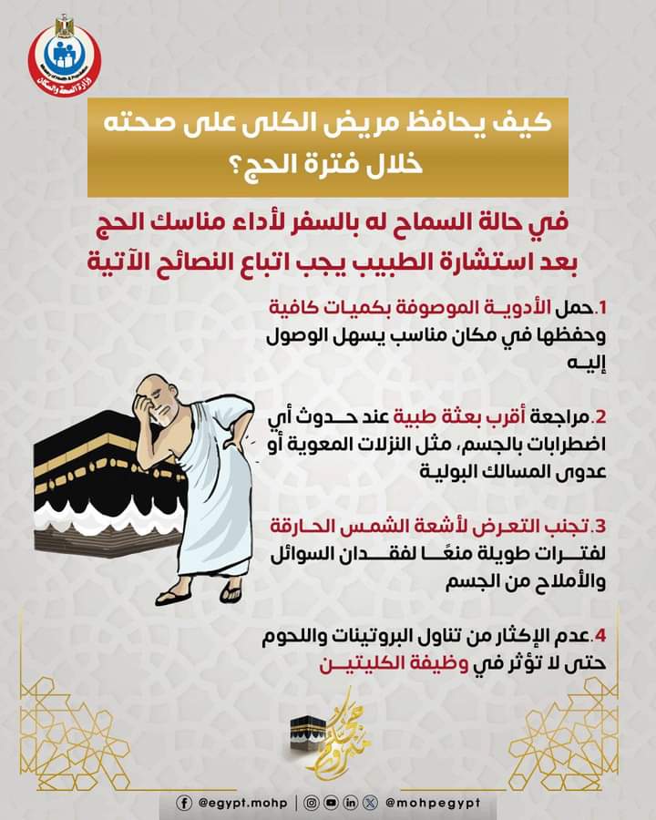وجهت وزارة الصحة نصائح لمرضى الكلى في موسم الحج ٢٠٢٤ منها أولًا استشارة الطبيب المعالج قبل السفر للمملكة العربية السعودية لأداء فريضة الحج.