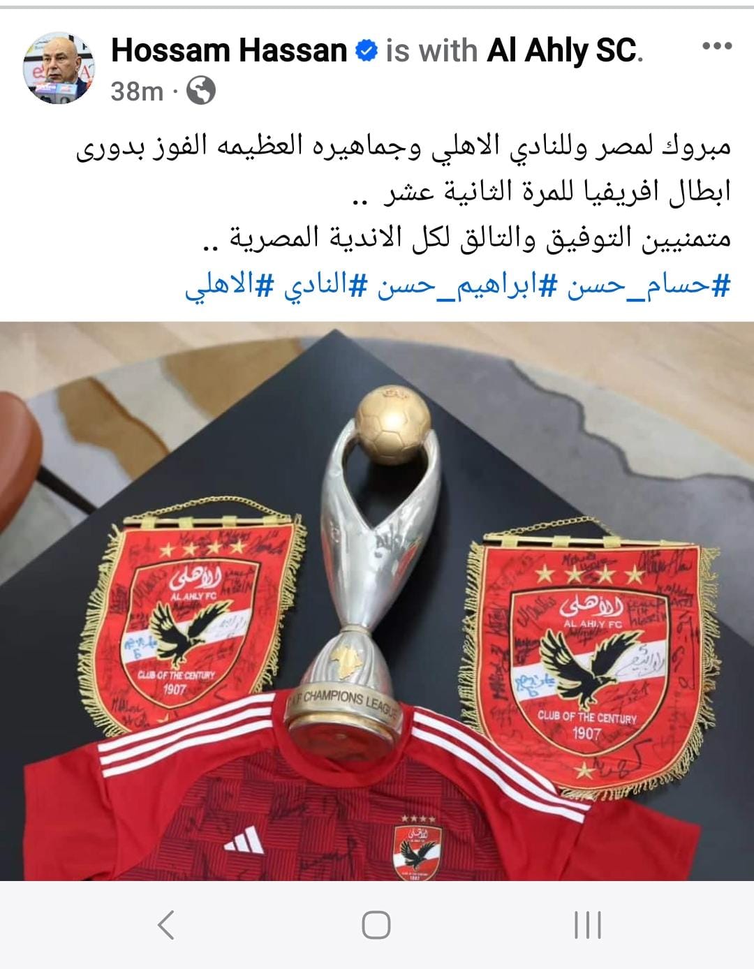 حسام وإبراهيم حسن يهنئان الأهلي بالتتويج بالبطولة الـ12 لدوري أبطال أفريقيا