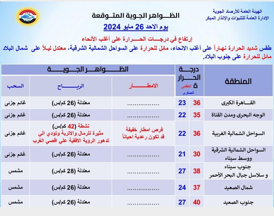 وأشارت هيئة الأرصاد إلى أن العظمى بالقاهرة تسجل اليوم الأحد 36 درجة، وجنوب الصعيد 40 درجة، لتصل غدا الإثنين إلى مستوى قياسي حيث تسجل العمى 40 درجة، وجنوب الصعيد 45 درجة.