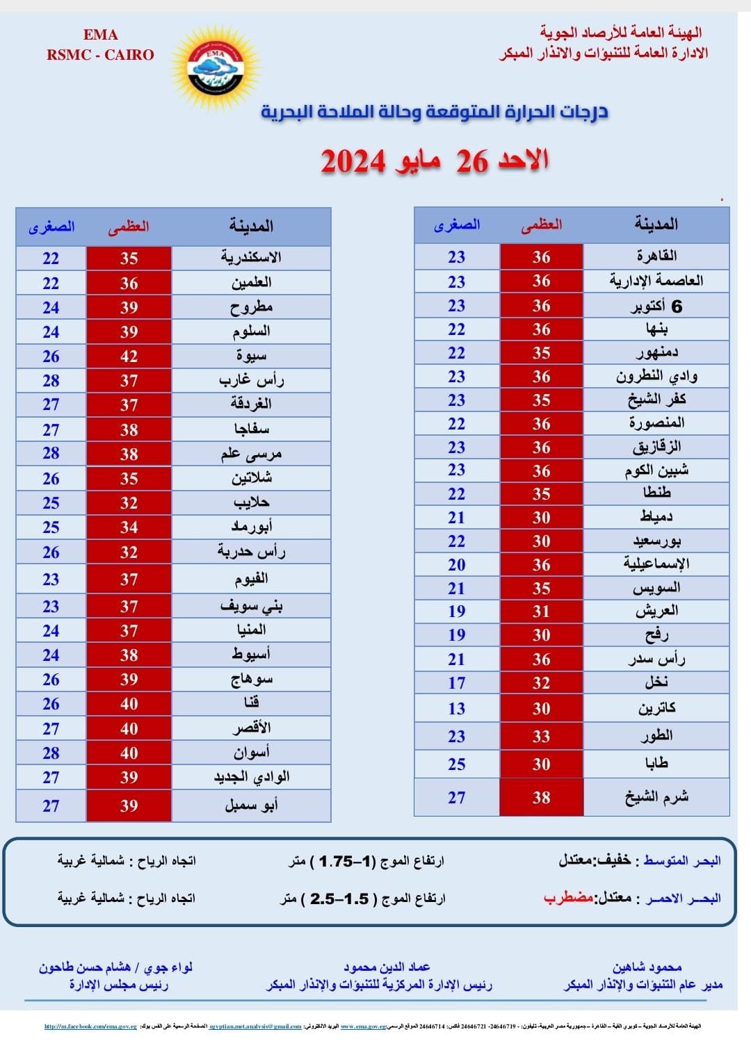 ونشرت هيئة الارصاد بيان بدرجات الحرارة المتوقعة اليوم على مدن ومحافظات مصر، والتي جاءت كالتالي: