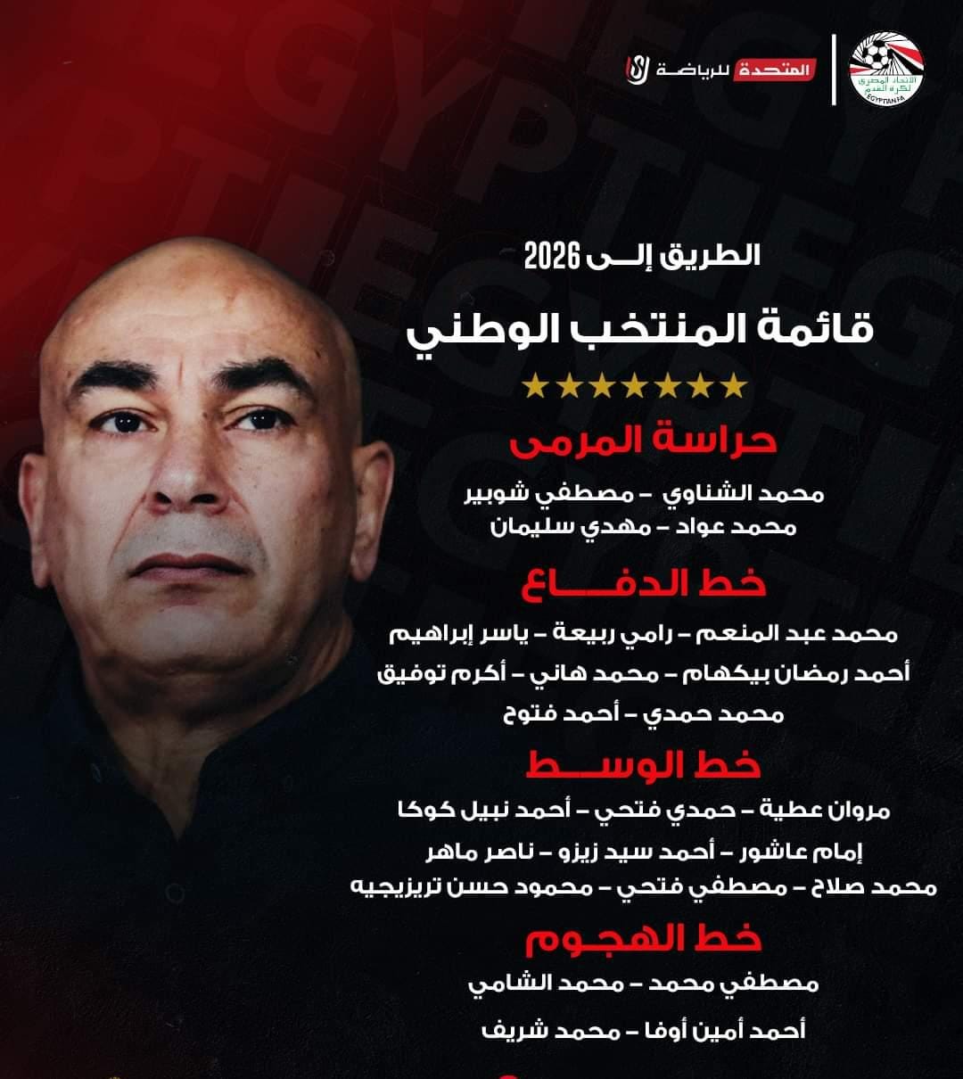 منتخب مصر، أعلن الجهاز الفني لمنتخب مصر بقيادة حسام حسن، قائمة الفراعنة المقرر انضمامها لمعسكر مغلق استعدادا لخوض مباراتي بوركينا فاسو وغينيا بيساو في تصفيات كأس العالم.