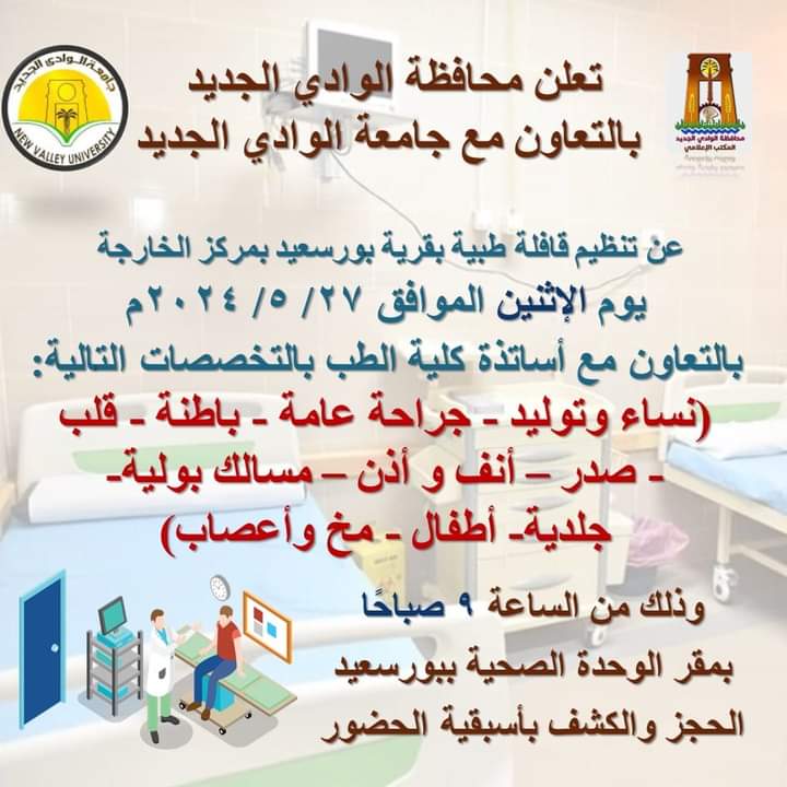 تنظم كلية الطب جامعة الوادي الجديد، غدًا الإثنين، قافلة طبية مجانية، لتوقيع الكشف الطبي على أهالي قرى بورسعيد بواحة الخارجة بمحافظة الوادي الجديد، بمقر الوحدة الصحية ببورسعيد، وذلك في إطار دور الجامعة في مجال خدمة المجتمع وتنمية البيئة.