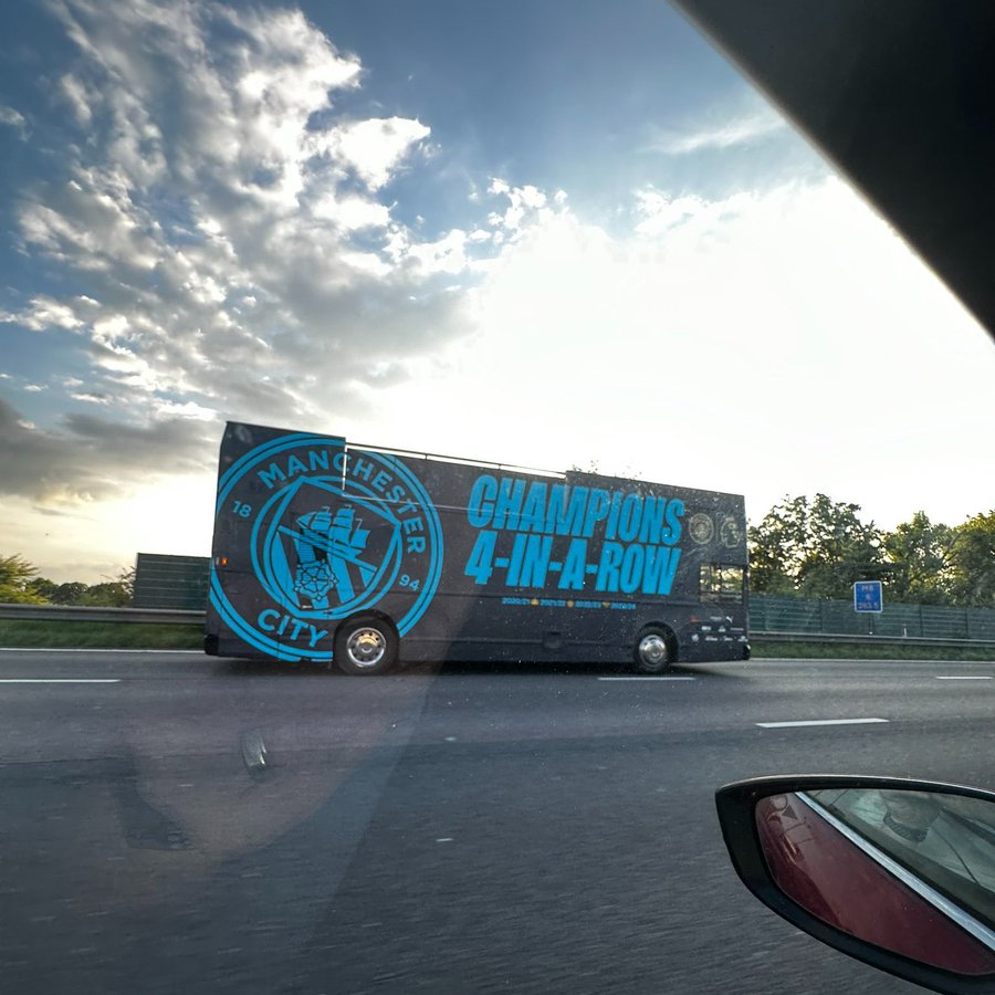 يجهز نادي مانشستر سيتي حافلة مكشوفة من أجل الاحتفال مع جماهيره في شوارع مانشستر بالفوز بلقب الدوري الإنجليزي الممتاز لهذا الموسم والرابع على التوالي.