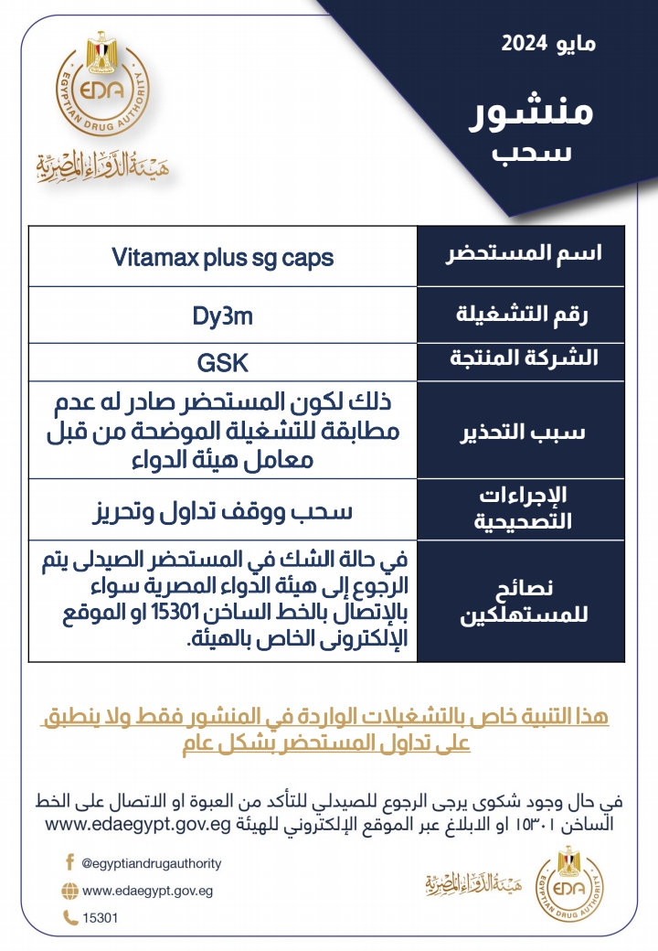 أصدرت هيئة الدواء المصرية منشور سحب وتحريز عبوات من المكمل الغذائي فيتاماكس "Vitamax Plus" بتركيبة الكبسولات الجيلاتينية، بعد أن ثبت أنه غير مطابق للمواصفات.