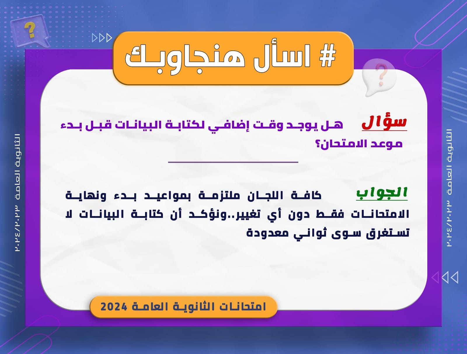 وأكدت وزارة التربية والتعليم والتعليم الفني، أن كافة اللجان ملتزمة بمواعيد بدء ونهاية الامتحانات فقط دون أي تغيير في امتحانات الثانوية العامة 2024، مشيرة إلى أن كتابة البيانات لا تستغرق سوى ثوانٍ معدودة.