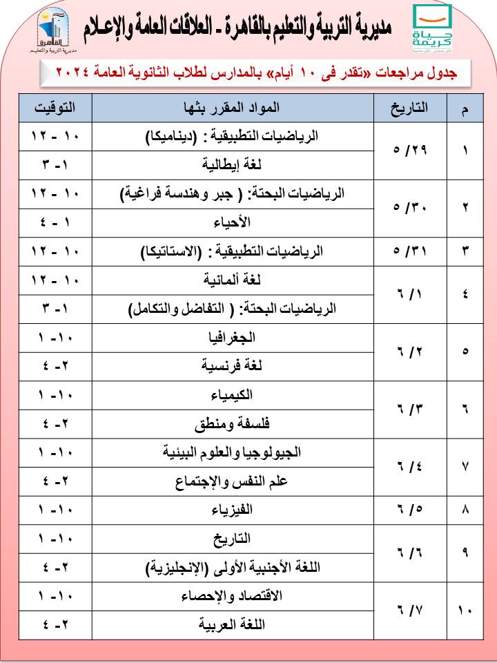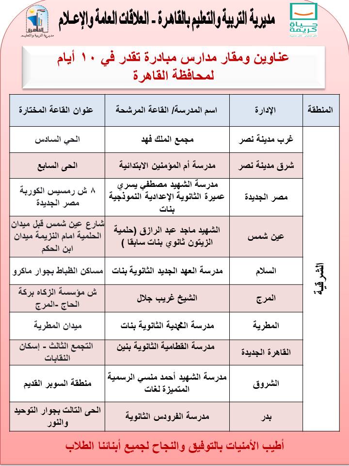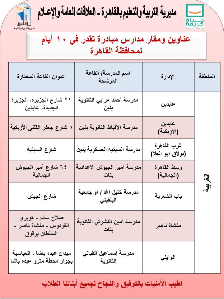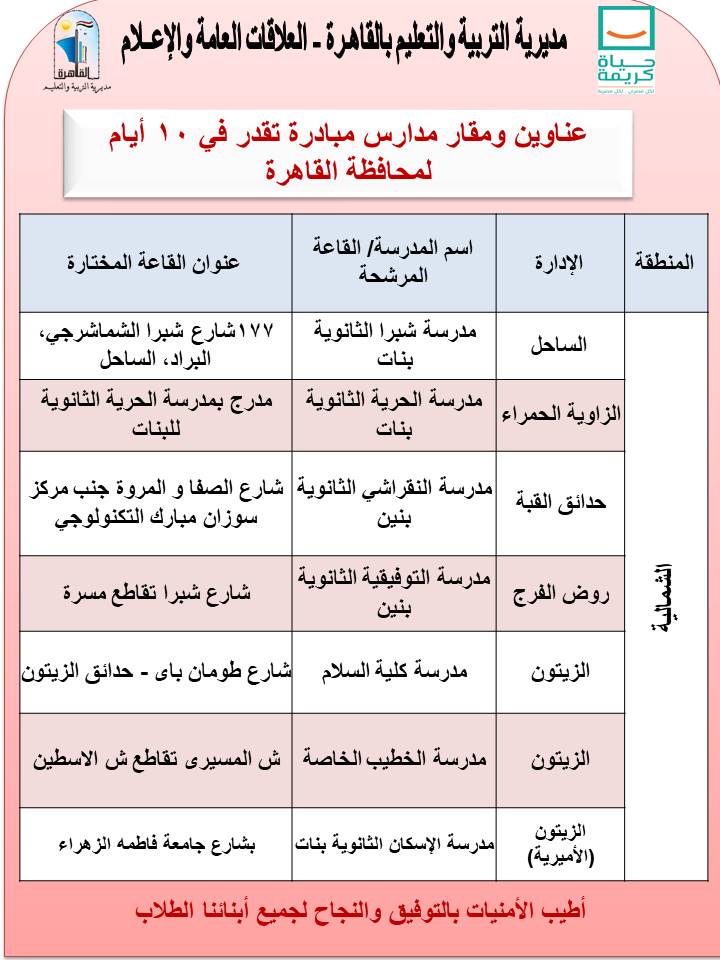 أعلنت مديرية التربية والتعليم بالقاهرة، عن عناوين ومقار مدارس مراجعات الثانوية العامة لمبادرة " تقدر فى ١٠ أيام " فى جميع الإدارات التعليمية، وذلك لضمان تحقيق أقصى استفادة لأبنائنا الطلاب من هذه المراجعات.