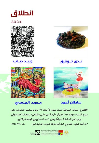 أعلن قطاع الفنون التشكيلية برئاسة الدكتور وليد قانوش عن إقامة معرض جماعي للفنانين ندي توفيق، ووليد دياب، وسلطان أحمد، ومحمد المنسي بمركز كرمة بن هانئ الثقافي بمتحف أحمد شوقي، بعنوان "انطلاق".