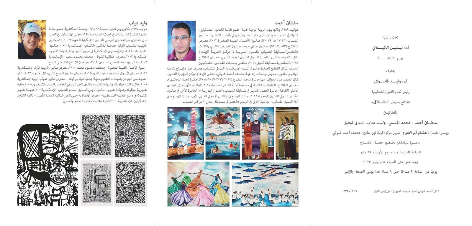 ومن المقرر أن يقام المعرض الجماعي “انطلاق” في تمام الساعة الـ 7 من مساء يوم الاربعاء الموافق 29 مايو الجاري، على أن يستمر حتى 8 يونيو القادم.