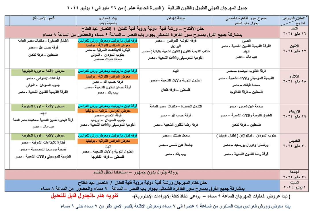 ويُقام حفل الافتتاح فى تمام الساعة التاسعة من مساء اليوم الأحد 26 مايو بـ مسرح سور القاهرة الشمالي بجوار باب النصر بجوار شارع المعز الأثري، وسيكون الدخول مجانًا بدون تذاكر والدخول لحضور حفل الافتتاح يبدأ من الساعة 8 مساءً … والجدول كالتالي: