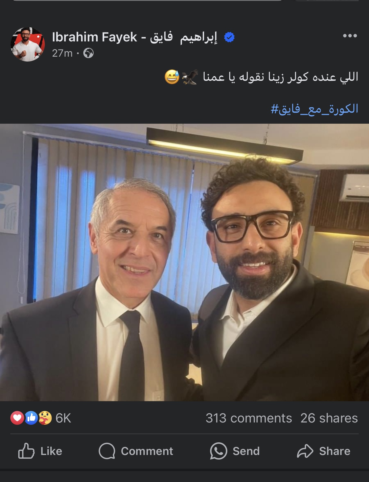 وأعلن إبراهيم فايق عن استضافة كولر عبر برنامجه الجديد، بعد نشر صورته مع المدرب السويسري عبر صفحته علي فيسبوك قائلًا “اللي عنده كولر زينا نقوله يا عمنا”.
