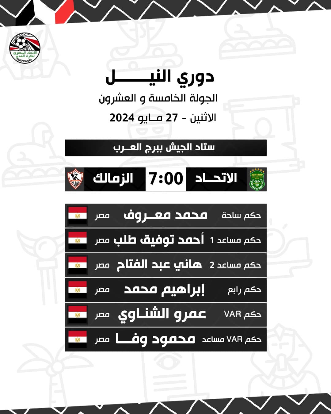 مباراة الاتحاد والزمالك، يديرها محمد معروف حكما للساحة ويعاونه كل من أحمد توفيق طلب مساعد اول وهاني عبد الفتاح مساعد ثاني وإبراهيم محمد حكما رابعا وعمرو الشناوي حكم فيديو ومحمود وفا عاشور حكم فيديو مساعد.