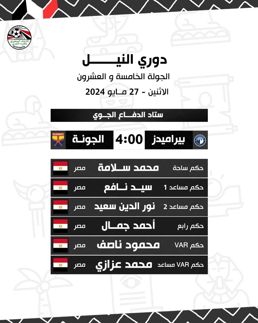 مباراة بيراميدز أمام الجونة يديرها محمد سلامة " ميدو " حكما للساحة ويعاونه كل من سيد نافع مساعد أول ونور سعيد مساعد ثاني وأحمد جمال حكما رابعا ومحمود ناصف حكم فيديو ومحمد عزازي حكم فيديو مساعد .
