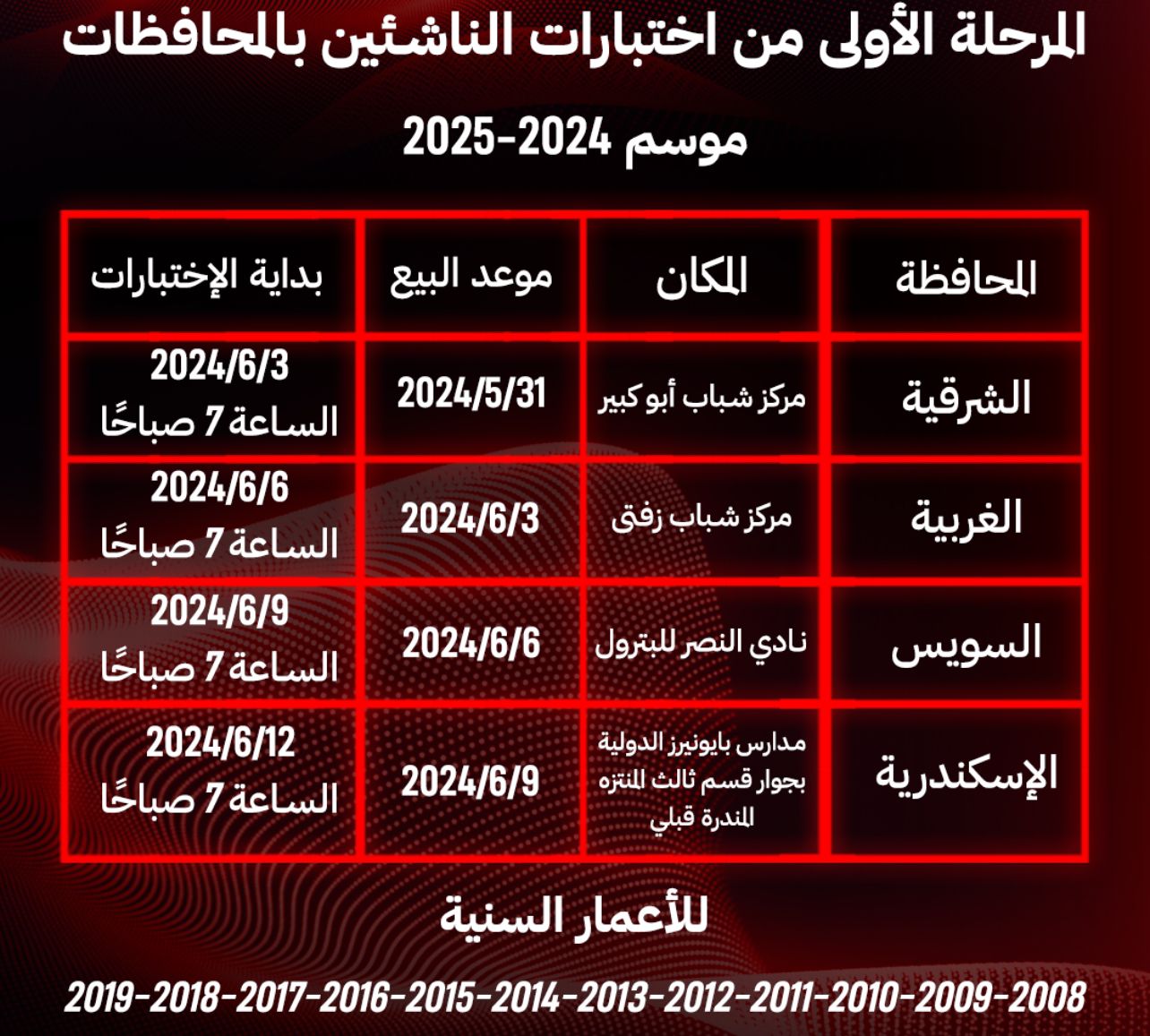 اختبارات الناشئين 2024، يستعد قطاع الناشئين بالنادي الأهلي لإجراء اختبارات الناشئين في محافظات "الغربية والشرقية والسويس والإسكندرية" خلال الأيام المقبلة في المرحلة الأولى.