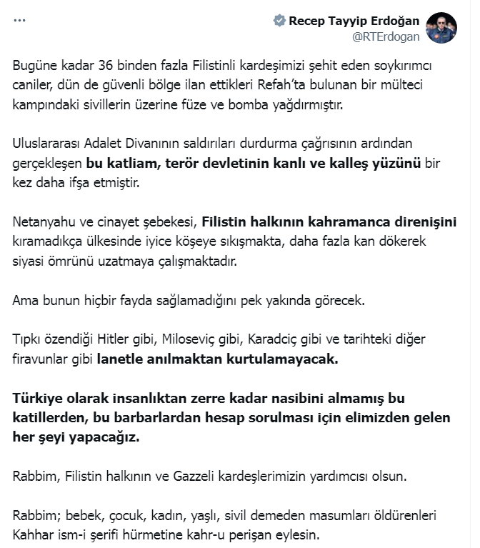 وقال رجب أردوغان عن مذبحة رفح: "إن المجرمين مرتكبي الإبادة الجماعية الذين قتلوا أكثر من 36 ألف من أشقائنا الفلسطينيين حتى الآن، ألقوا أمس الصواريخ والقنابل كالمطر على المدنيين في مخيم اللاجئين في رفح التي أعلنوا أنها منطقة آمنة".