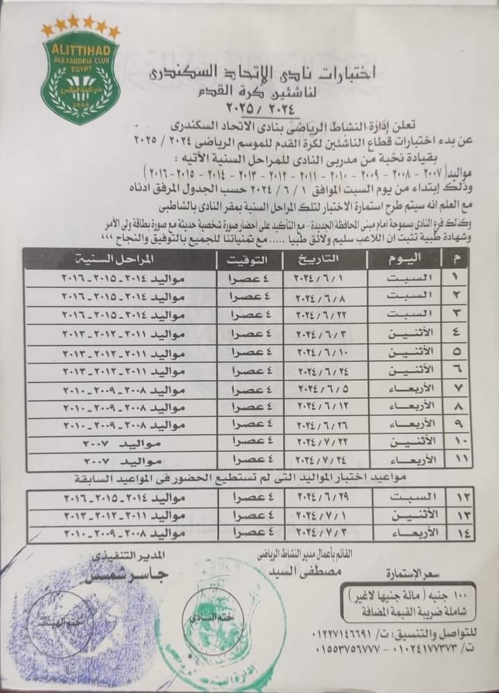وجاءت تفاصيل اختبارات الناشئين بنادي الاتحاد السكندري موسم 2024-2025 كالتالي: