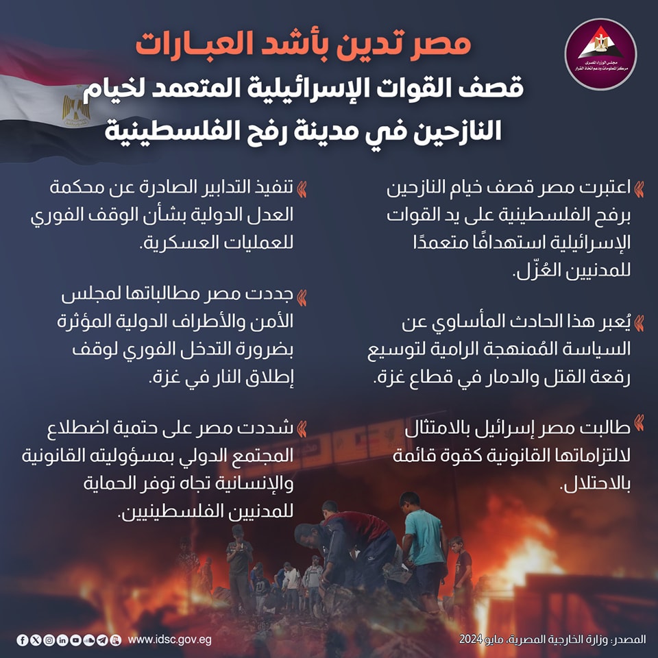 وذلك بعد أن أدانت مصر بأشد العبارات في بيان صادر عن وزارة الخارجية، قصف القوات الإسرائيلية المتعمد لخيام النازحين في مدينة رفح الفلسطينية، الأمر الذي أسفر عن سقوط المئات من القتلى والمصابين بين صفوف الفلسطينيين النازحين العزل، في انتهاك جديد وسافر لأحكام القانون الدولي الإنساني، وبنود اتفاقية چنيف الرابعة لعام 1949 بشأن حماية الأشخاص المدنيين في وقت الحرب.