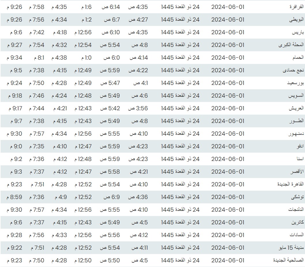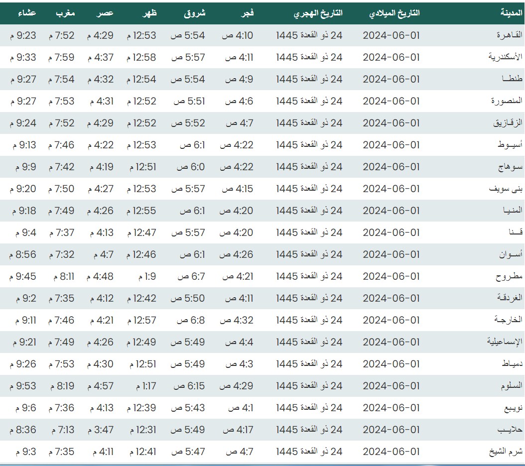 مواقيت الصلاة اليوم وفقًا للتوقيت المحلي لمدينتي القاهرة والإسكندرية وكذلك،مواقيت الصلاة، لعدد من مدن ومحافظات الجمهورية من واقع بيانات الهيئة العامة للمساحة