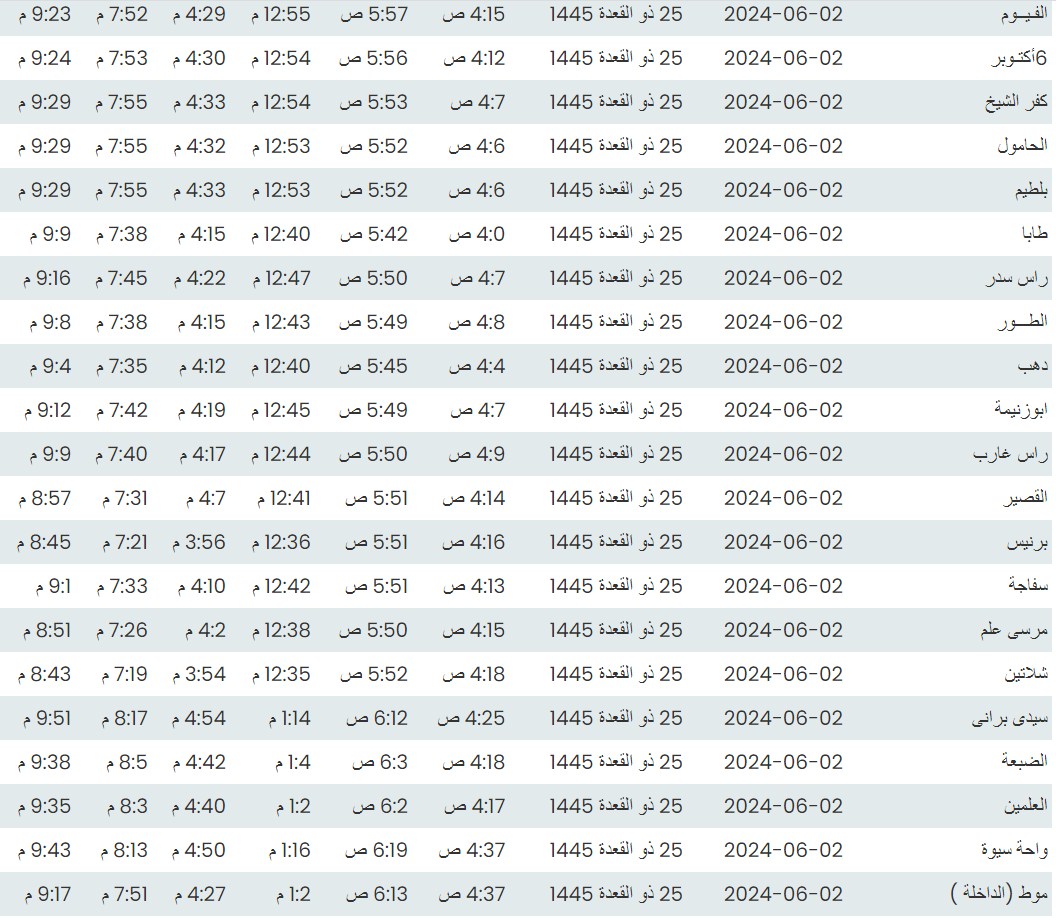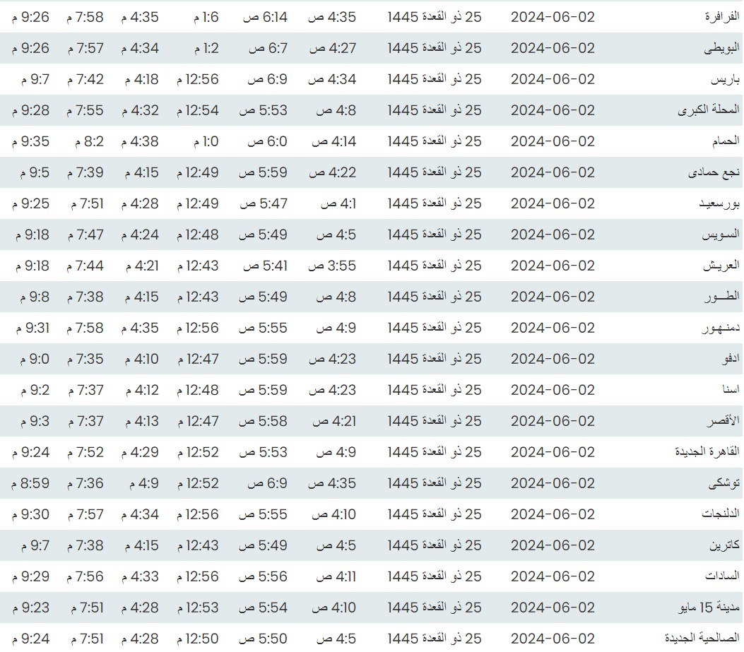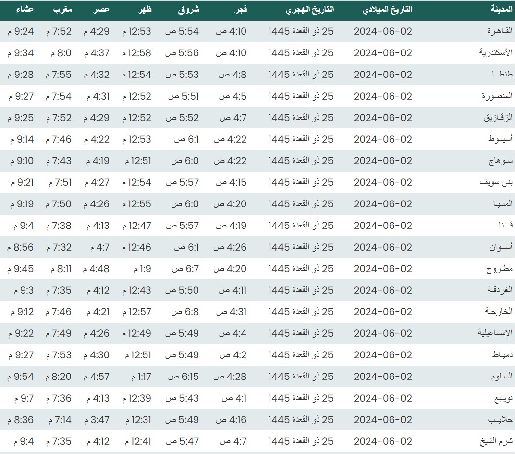 وفيما يلي مواقيت الصلاة، لعدد من مدن ومحافظات الجمهورية من واقع بيانات الهيئة العامة للمساحة