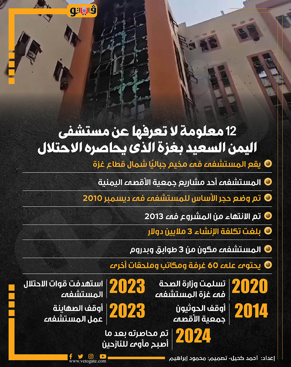 12 معلومة لا تعرفها عن مستشفى اليمن السعيد بغزة الذي يحاصره الاحتلال (إنفوجراف) الثلاثاء 28/مايو/2024 - 08:47 م 5/28/2024 8:47:48 PM مستشفى اليمن السعيد بغزة، فيتو أحمد كحيل شارك طباعة 18 حجم الخط شارك طباعة غزة مستشفى اليمن السعيد مستشفيات غزة فلسطين