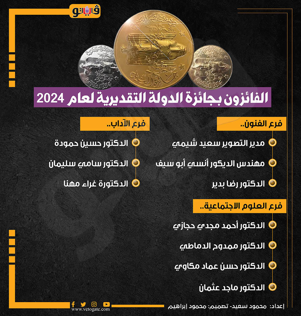 الفائزون بجائزة الدولة التقديرية لعام 2024 (إنفو جراف) الثلاثاء 28/مايو/2024 - 09:52 م 5/28/2024 9:52:27 PM إعلان الفائزين بجائزة الدولة التقديرية، فيتو محمود سعيد شارك طباعة 18 حجم الخط شارك طباعة الفائزون بجائزة الدولة التقديرية 2024 الجائزة التقديرية جوائز الدولة