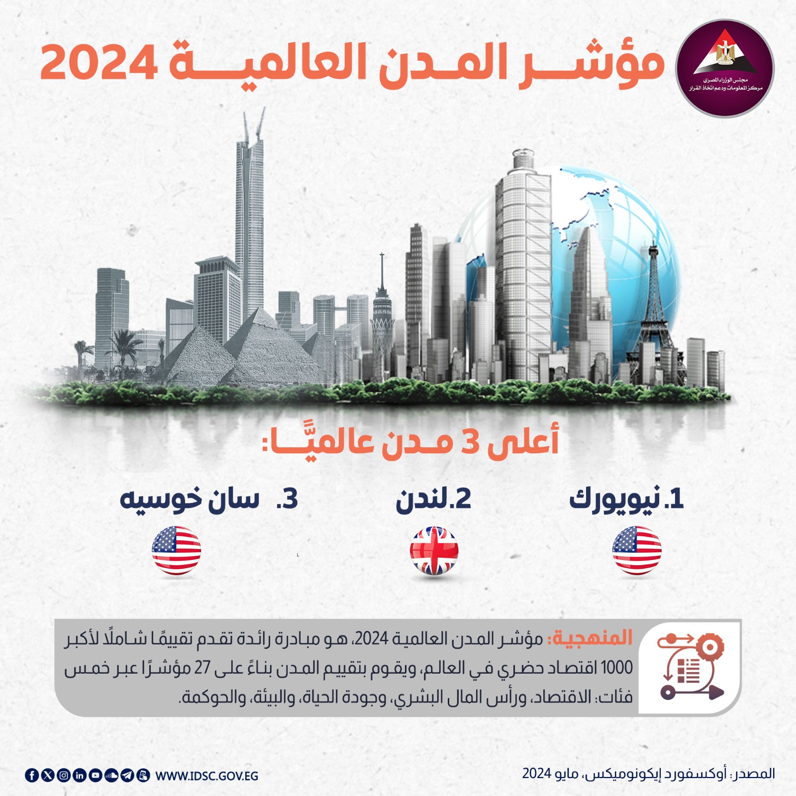 كشف مركز المعلومات ودعم اتخاذ القرار بمجلس الوزراء الضوء عن مؤشر المدن العالمية في 2024.