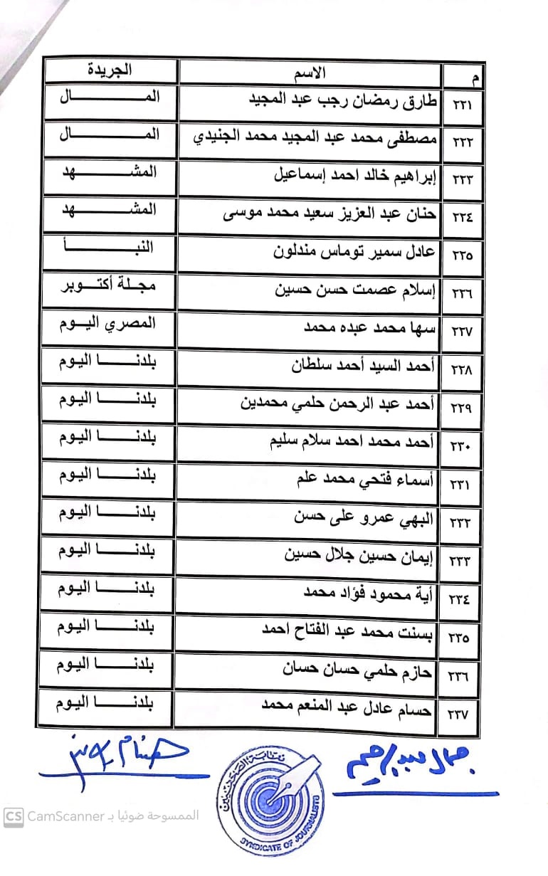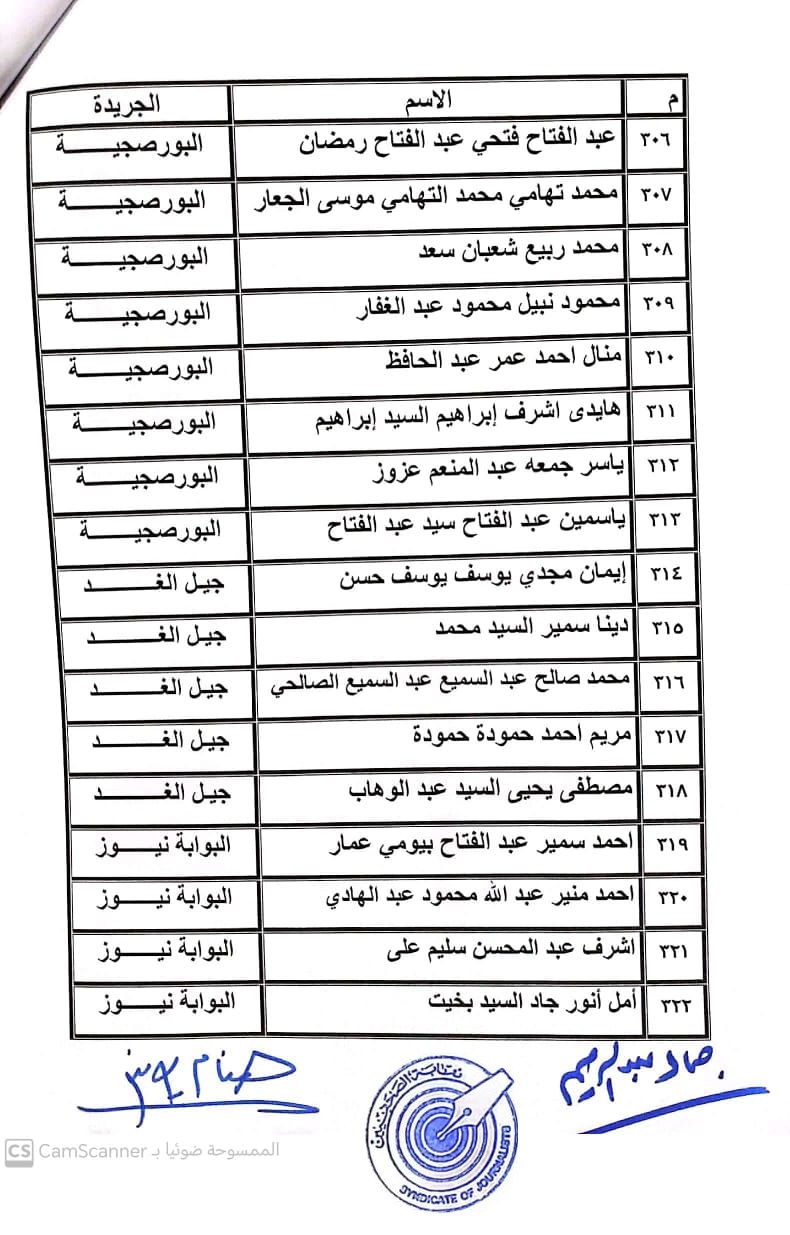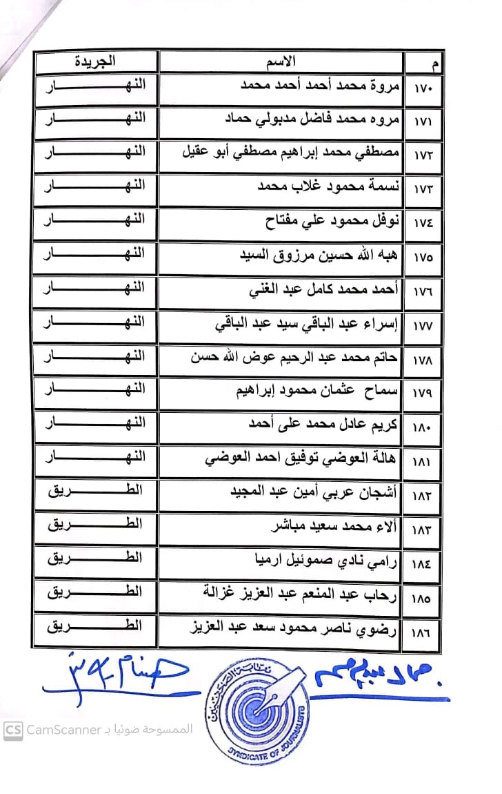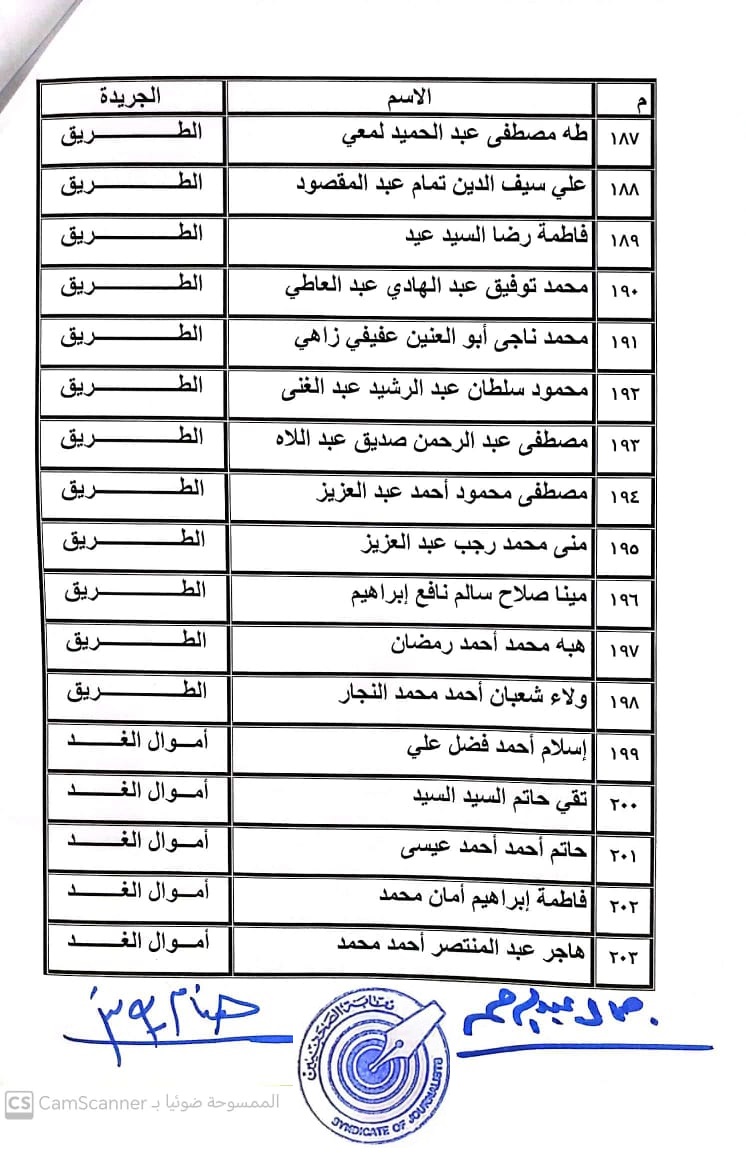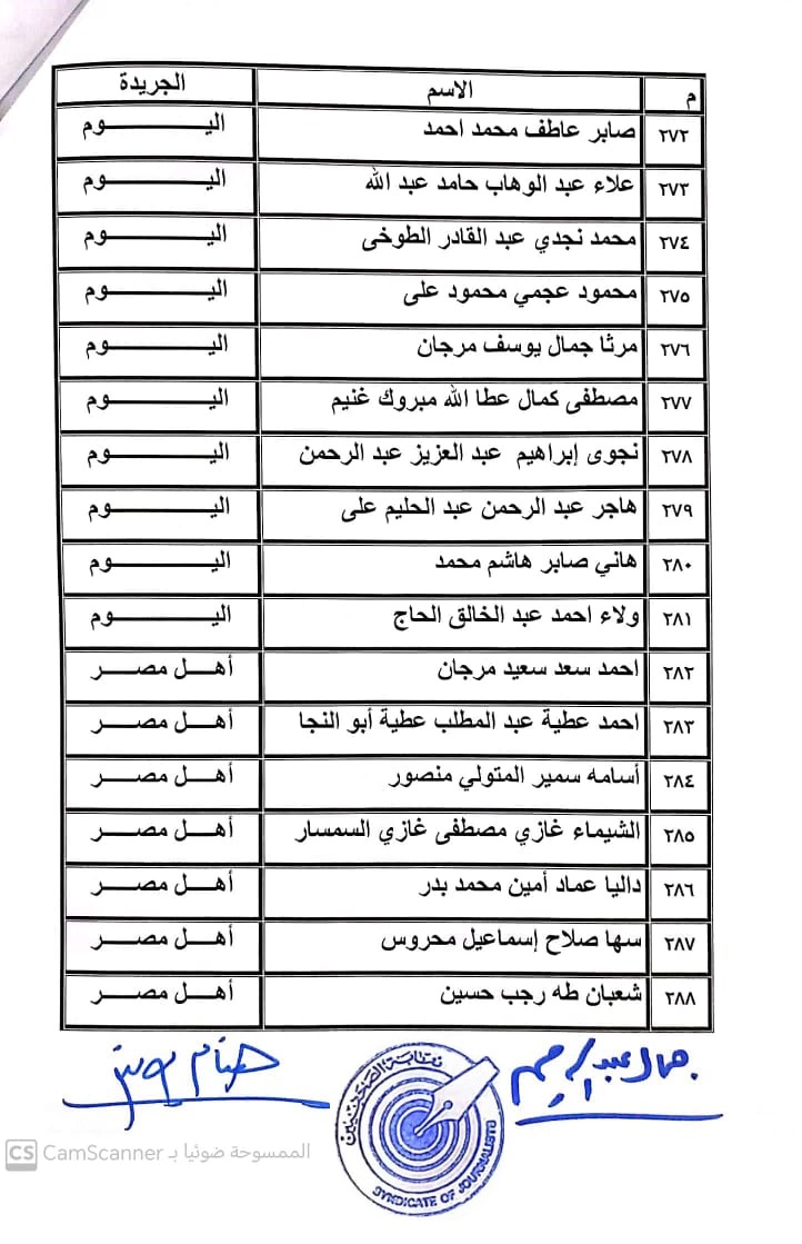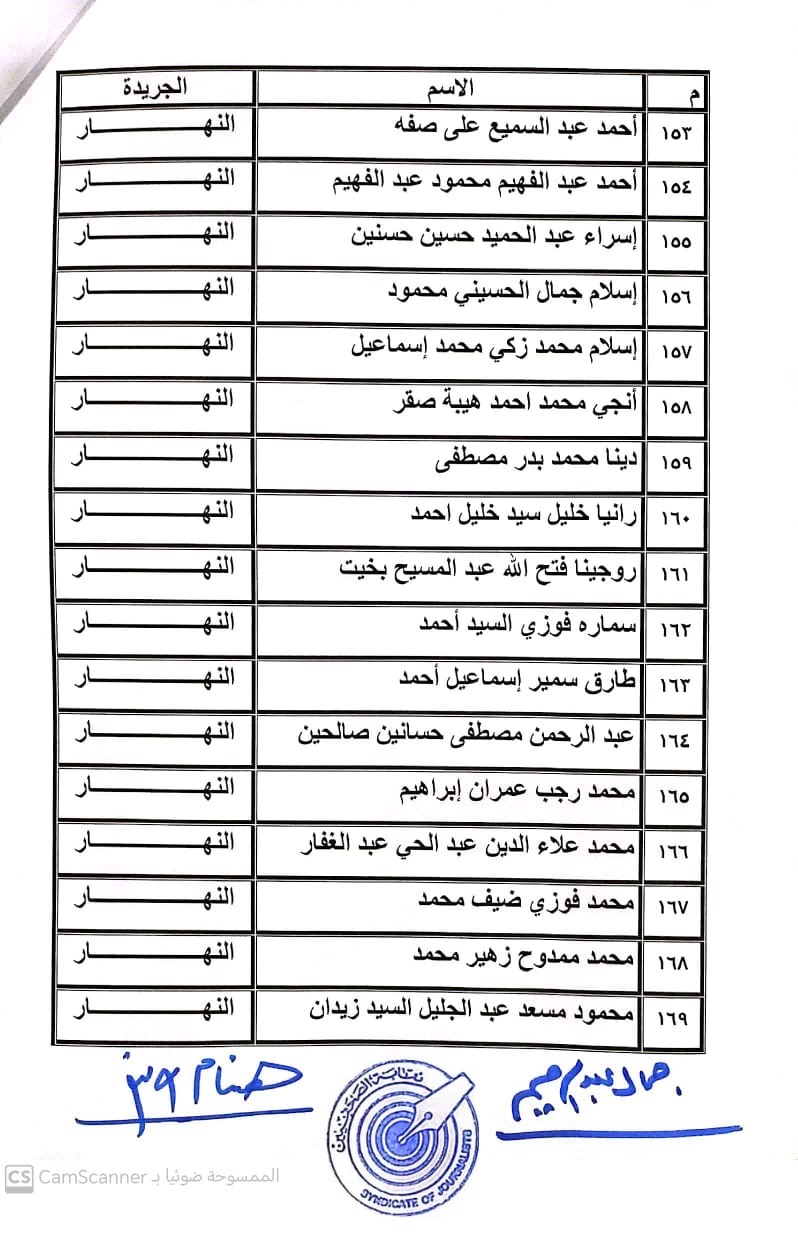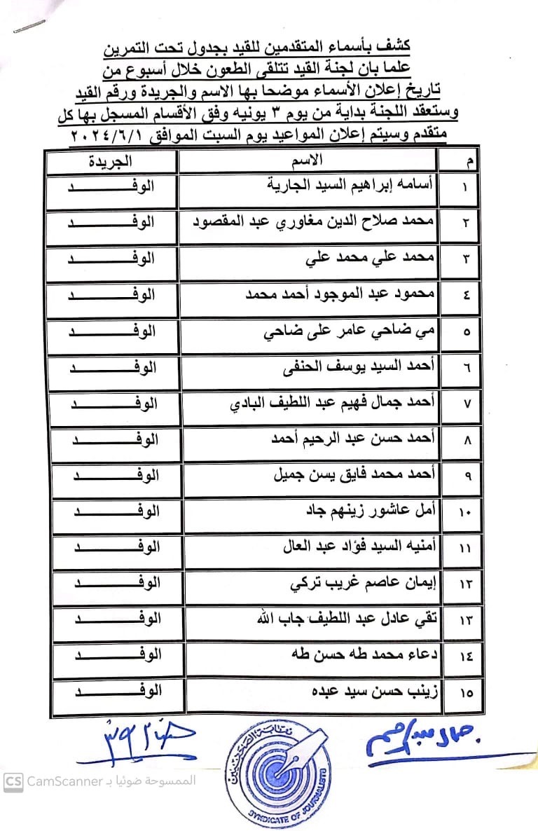 أعلنت لجنة القيد بنقابة الصحفيين, أسماء المتدربين المتقدمين للجنة جدول تحت التمرين لمن اجتازوا الدورات التدريبية وتقدموا للجنة بأرشيف عن مجمل أعمالهم الصحفية.