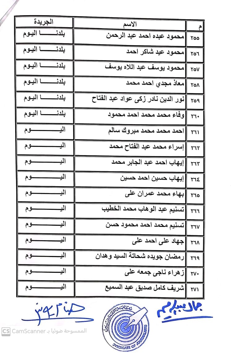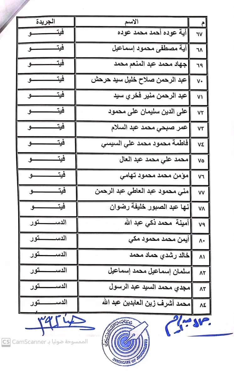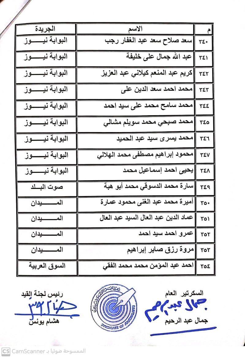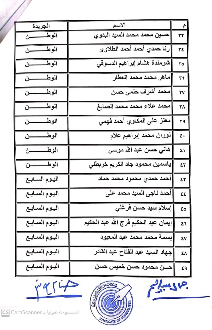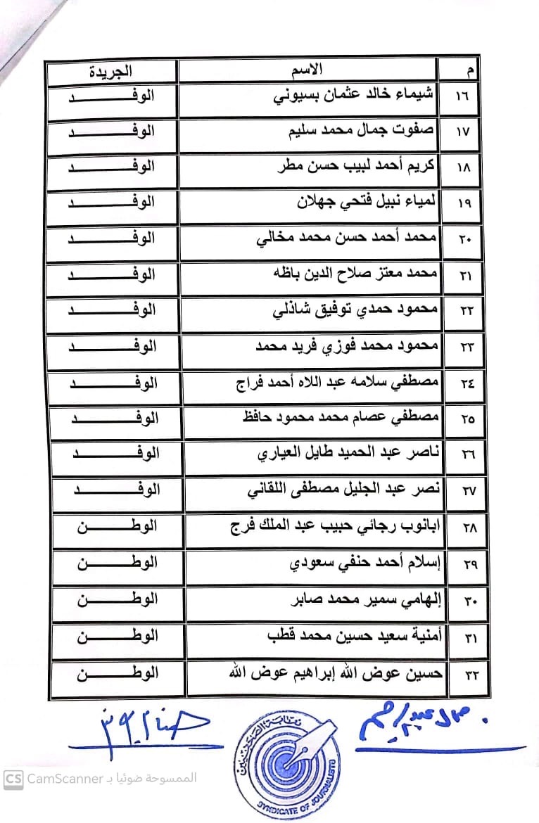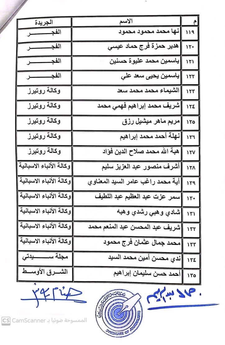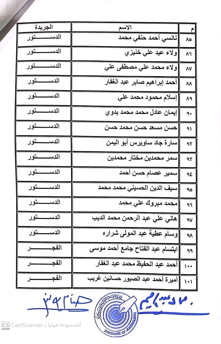 أعلنت لجنة القيد بنقابة الصحفيين, أسماء المتدربين المتقدمين للجنة جدول تحت التمرين لمن اجتازوا الدورات التدريبية وتقدموا للجنة بأرشيف عن مجمل أعمالهم الصحفية.