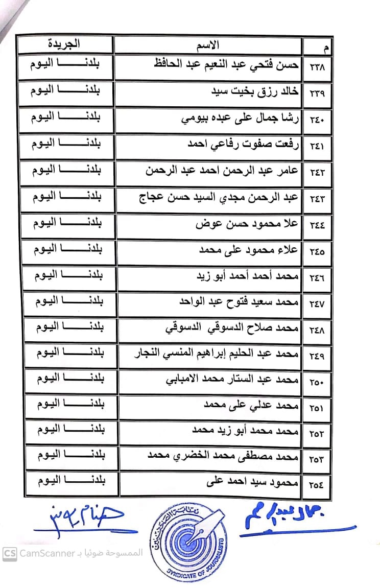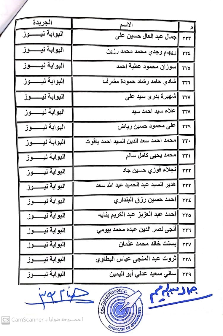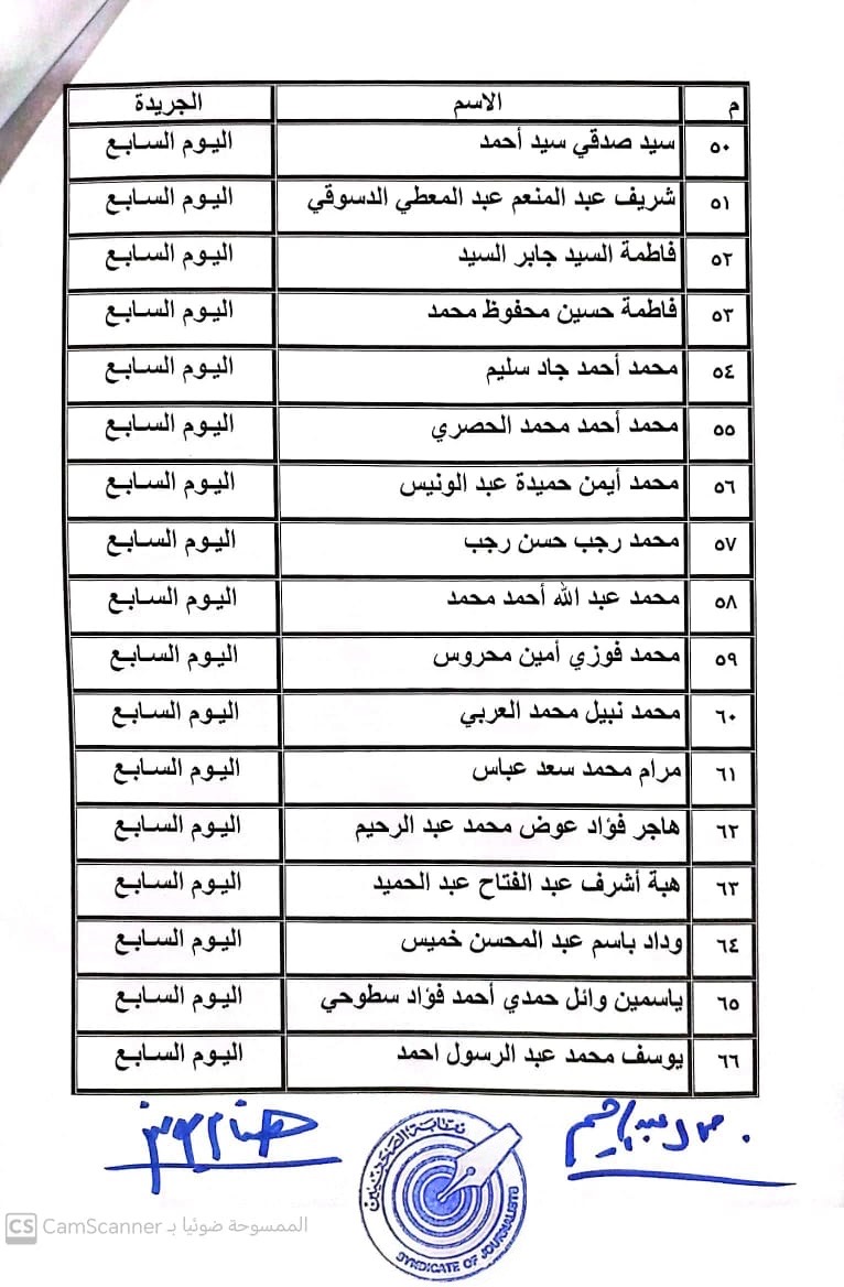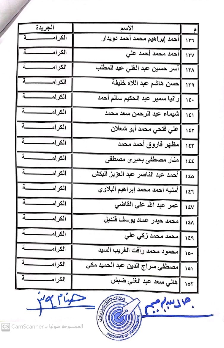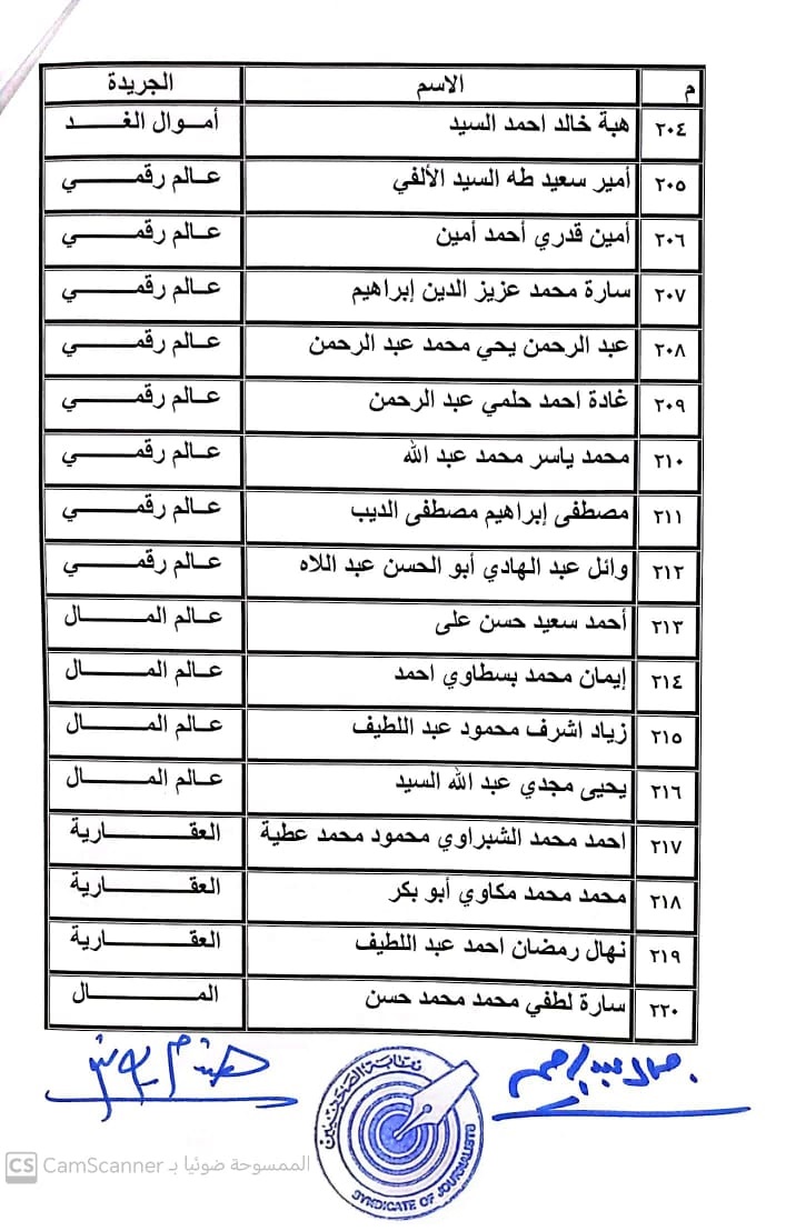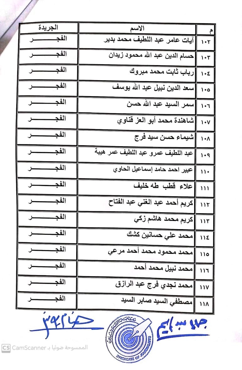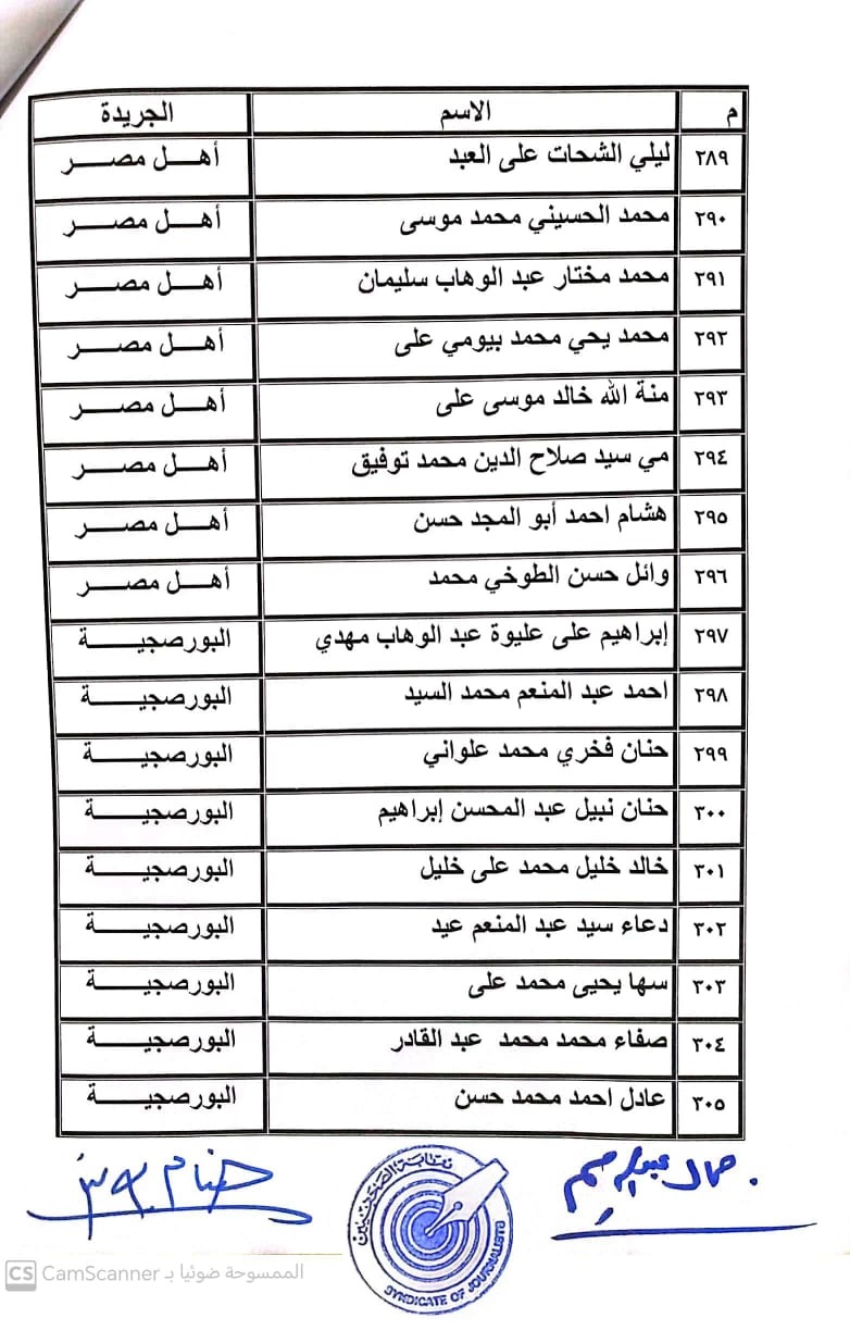 أعلنت لجنة القيد بنقابة الصحفيين, أسماء المتدربين المتقدمين للجنة جدول تحت التمرين لمن اجتازوا الدورات التدريبية وتقدموا للجنة بأرشيف عن مجمل أعمالهم الصحفية.